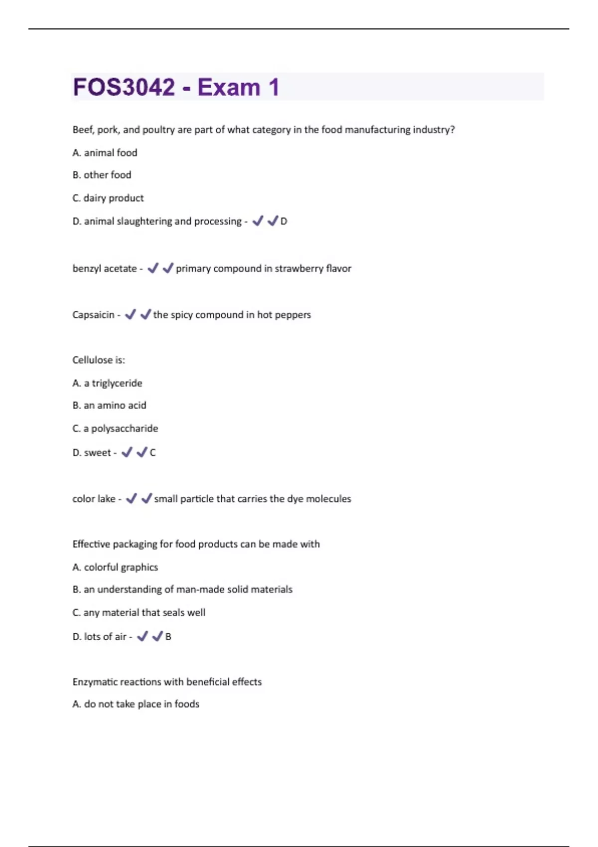 Beef, pork, and poultry are part of what category in the food manufacturing industry? A. animal food B. other food C. dairy product D. animal slaughtering and processing - D benzyl acetate - primary compound in strawberry flavor Capsaicin - the spicy compound in hot peppers Cellulose is: A. a triglyceride B. an amino acid C. a polysaccharide D. sweet - C color lake - small particle that carries the dye molecules Effective packaging for food products can be made with A. colorful graphics B. an understanding of man-made solid materials C. any material that seals well D. lots of air - B Enzymatic reactions with beneficial effects A. do not take place in foodsB. take place in fermented foods like yogurt C. take place in canned foods such as spinach D. take place in foods such as orange juice - B How does food technology differ from food science? A. it does not. B. food science studies the effect of food on the consumer. food tech. is the study of the nature of foods C. food technology is a misnomer for food science D. food technology is the. application of food science to manufacture and distribute safe, nutritious, and wholesome food - D How is bloom strength measured? A. the candy make drops some syrup for it to spread. How far it spreads is a measure of bloom strength. B. gelatin samples are punctured by a probe. The amount of force required by the probe to penetrate a fixed depth is a measure of bloom strength. C. A selected group of consumers chews the candy. The number of chews before the candy can be swallowed gives bloom strength. D. any of the methods would be good - B In the presence of heat or acid, chlorophyll is degraded to A. metachlorophyll B. oxychlorophyll C. pheophytin D. chlorophytin - C isoamyl acetate - primary compound in banana flavor limonene - primary compound in lemon flavorSaturated fatty acids A. contain an equal number of double bonds to carbons B. contain an equal number of double bonds to hydrogens C. do not contain double bonds in the carbon chain D. contain 18 carbons - C soluble dye - color molecules dissolved in water Starch A. is not very sweet B. can be modified for differing types of thickness C. thickens liquids to form gravies, pastes, and gels D. all of the above - D Sugar beet and sugar cane are the two major sources of sugar consumed today. Which came first? A. sugar beet B. sugar cane C. they were discovered around the same time - B The process where sugars and proteins form characteristic flavor compounds and brown melanoidin compounds is called A. Maillard browning B. carbonyl-amine browning C. non-enzymatic browning D. all of the above - D Understanding the changes in the quality of produce on the way to the grocery store is possible with the knowledge of: A. BiologyB. Nutrition C. Toxicology D. Materials Science - A