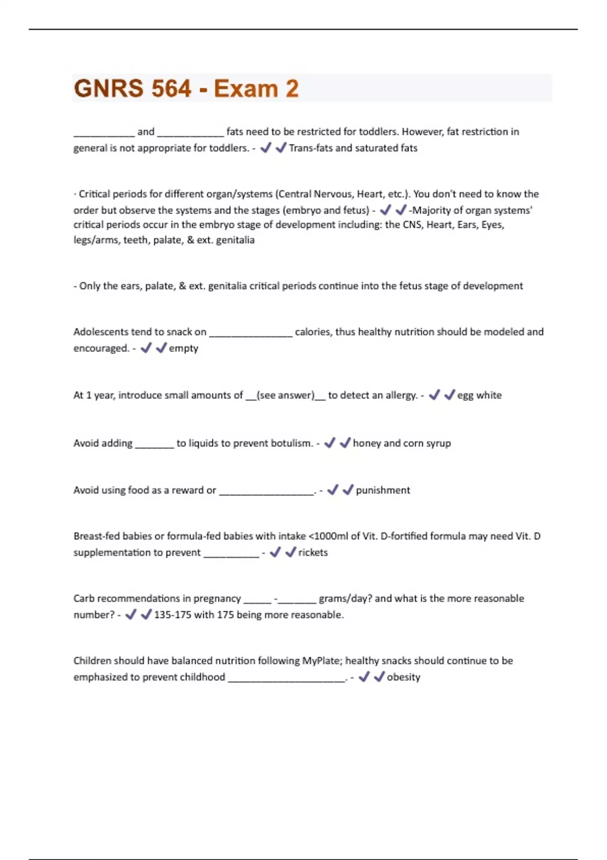 ___________ and ____________ fats need to be restricted for toddlers. However, fat restriction in general is not appropriate for toddlers. - Trans-fats and saturated fats · Critical periods for different organ/systems (Central Nervous, Heart, etc.). You don't need to know the order but observe the systems and the stages (embryo and fetus) - -Majority of organ systems' critical periods occur in the embryo stage of development including: the CNS, Heart, Ears, Eyes, legs/arms, teeth, palate, & ext. genitalia - Only the ears, palate, & ext. genitalia critical periods continue into the fetus stage of development Adolescents tend to snack on _______________ calories, thus healthy nutrition should be modeled and encouraged. - empty At 1 year, introduce small amounts of __(see answer)__ to detect an allergy. - egg white Avoid adding _______ to liquids to prevent botulism. - honey and corn syrup Avoid using food as a reward or _________________. - punishment Breast-fed babies or formula-fed babies with intake <1000ml of Vit. D-fortified formula may need Vit. D supplementation to prevent __________ - rickets Carb recommendations in pregnancy _____ -_______ grams/day? and what is the more reasonable number? - 135-175 with 175 being more reasonable. Children should have balanced nutrition following MyPlate; healthy snacks should continue to be emphasized to prevent childhood _____________________. - obesityConstipation: which type of fiber (soluble or insoluble) is recommended? Food examples of this fiber: - insoluble Food examples of this fiber: wheat bran, whole grains, fruits and vegetables. Describe which patient is appropriate for each dysphagia diet, the differences between them, and foods served with each diet - Level 1- Dysphagia pureed (worst level of dysphagia). Sample: cream of wheat, slurried muffins or pancakes, pureed meat. Avoid dry breads and cereals, no cottage cheese, peanut butter. Level 2- Dysphagia mechanically altered Sample: Moist oatmeal, thickened liquids, soup, slurried bread or crackers Avoid: dry or coarse foods, breads and cereals Level 3- Dysphagia advanced. Sample: cereal with milk, moist pancakes or muffins, chicken noodle soup. Avoid: Dry coarse foods, tough crusty breads Dumping Syndrome vs. Gastroparesis - o Dumping Syndrome- stomach empties hyperosmolar contents rapidly into the duodenum; is due to pyloric sphincter malfunction Symptoms: nausea, vomiting, diarrhea, & tachycardia o Gastroparesis- "Stomach paralysis;" damage to the nerves that enervate the stomach causing it to empty slowly Early adverse event/influence can cause permanent damage (w/o recovery) or temporary damage (w/poss. of recovery)? - Early adverse event causes PERMANENT damage and a full recovery never occurs Fat: generally recommend omega-___ and omega_____ fatty acids - Omega 3 and Omega 6Food sources for the Important Micronutrients of Pregnancy and lactation: -folate -iron -vitamin D -B12 -Calcium - -Folate: supplement+ fortified grains, green leafy vegetables (foliage), meat/liver, fish, legumes, oranges, grapefruit -Iron: Meat/Liver, legumes, eggs, dark green vegetables, bread/cereal, dried fruits -Vitamin D: Vit. D fortified milk, cereals, fish oils, sunlight -B12: Meat/liver (NCLEX), fish, eggs, milk products -Calcium: Milk, soy milk, cheese, yogurt, tofu, collard greens, rhubarb, sardines Foods that place baby/toddler at risk for choking are: - nuts, foods with seeds, raisins, popcorn, grapes and hot dog pieces. gastritis vs. Peptic Ulcer disease - o Gastritis- inflammation of the stomach tissue o Peptic Ulcer Disease- open sore in the esophagus, stomach, or duodenum How is GERD different than a hiatal hernia? - o GERD - reflux (backward flow of acid from the stomach into the esophagus) occurs due to weak or relaxed lower esophageal sphincter; can be associated with obesity, pregnancy, & hiatal hernia o Hiatal Hernia - occurs when the upper part of the stomach bulges through an opening in the diaphragm; can cause heartburn, chest pain, & abdominal painHow many calories, carbs, and protein in non-pregnant women, pregnant women, and lactating? - Non-prego- kcals, 130g carb, 46g protein Prego- +350 kcal 2nd and +450 in 3rd trimester; 175 g carbs, 71g protein Lactating- +330 1st 6 months, +400 2nd 6 months; 210g carbs, 71g protein