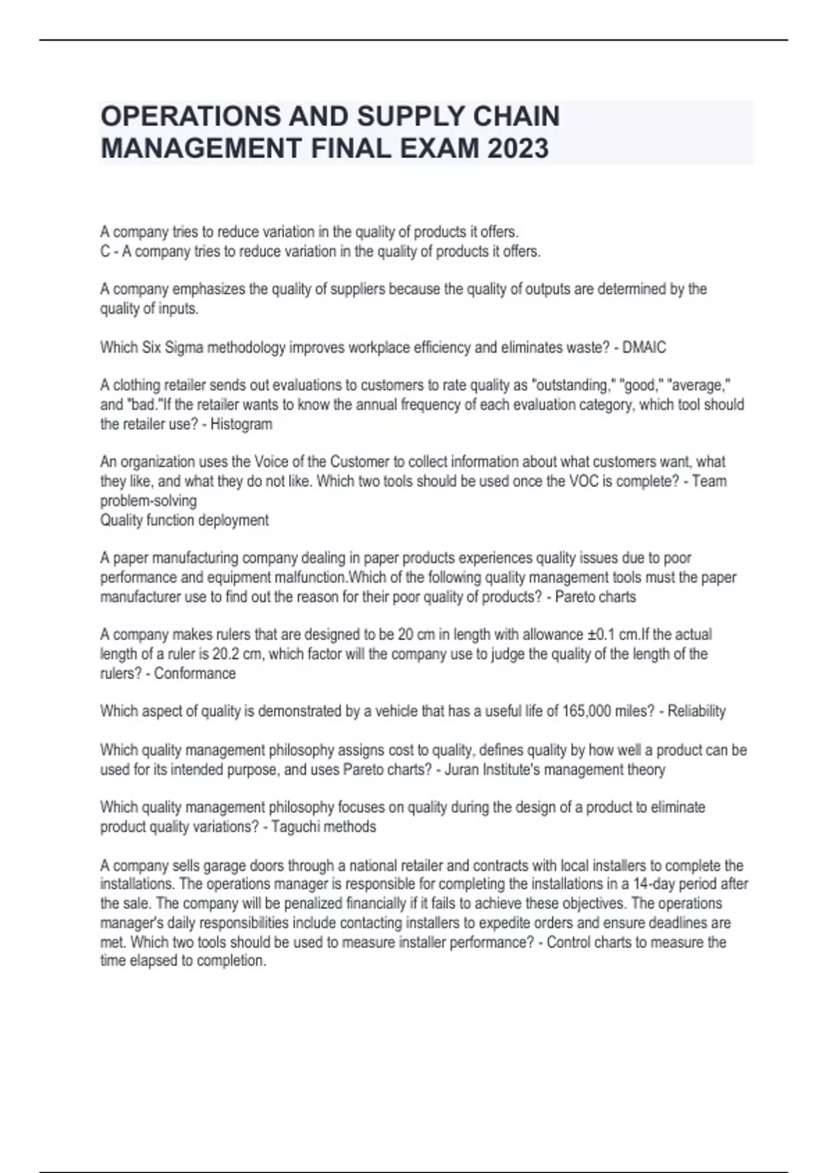 OPERATIONS AND SUPPLY CHAIN MANAGEMENT FINAL EXAM 2023 A company tries to reduce variation in the quality of products it offers. C - A company tries to reduce variation in the quality of products it offers. A company emphasizes the quality of suppliers because the quality of outputs are determined by the quality of inputs. Which Six Sigma methodology improves workplace efficiency and eliminates waste? - DMAIC A clothing retailer sends out evaluations to customers to rate quality as "outstanding," "good," "average," and "bad."If the retailer wants to know the annual frequency of each evaluation category, which tool should the retailer use? - Histogram An organization uses the Voice of the Customer to collect information about what customers want, what they like, and what they do not like. Which two tools should be used once the VOC is complete? - Team problem-solving Quality function deployment A paper manufacturing company dealing in paper products experiences quality issues due to poor performance and equipment malfunction.Which of the following quality management tools must the paper manufacturer use to find out the reason for their poor quality of products? - Pareto charts A company makes rulers that are designed to be 20 cm in length with allowance ±0.1 cm.If the actual length of a ruler is 20.2 cm, which factor will the company use to judge the quality of the length of the rulers? - Conformance Which aspect of quality is demonstrated by a vehicle that has a useful life of 165,000 miles? - Reliability Which quality management philosophy assigns cost to quality, defines quality by how well a product can be used for its intended purpose, and uses Pareto charts? - Juran Institute's management theory Which quality management philosophy focuses on quality during the design of a product to eliminate product quality variations? - Taguchi methods A company sells garage doors through a national retailer and contracts with local installers to complete the installations. The operations manager is responsible for completing the installations in a 14-day period after the sale. The company will be penalized financially if it fails to achieve these objectives. The operations manager's daily responsibilities include contacting installers to expedite orders and ensure deadlines are met. Which two tools should be used to measure installer performance? - Control charts to measure the time elapsed to completion. Run charts to chart output around the 14-day central tendency. The CEO of a service company wants to change the strategy of the company from volume sales to high quality products. Which philosophy should the CEO implement to emphasize quality over volume? - Deming's 14 points Which quality tool examines patterns, flow, and causes of variation of data points over time? - Statistical process control
