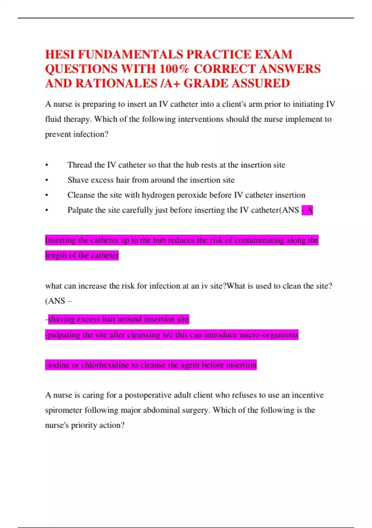 HESI FUNDAMENTALS PRACTICE EXAM QUESTIONS WITH 100% CORRECT ANSWERS AND RATIONALES A+ GRADE ASSURED