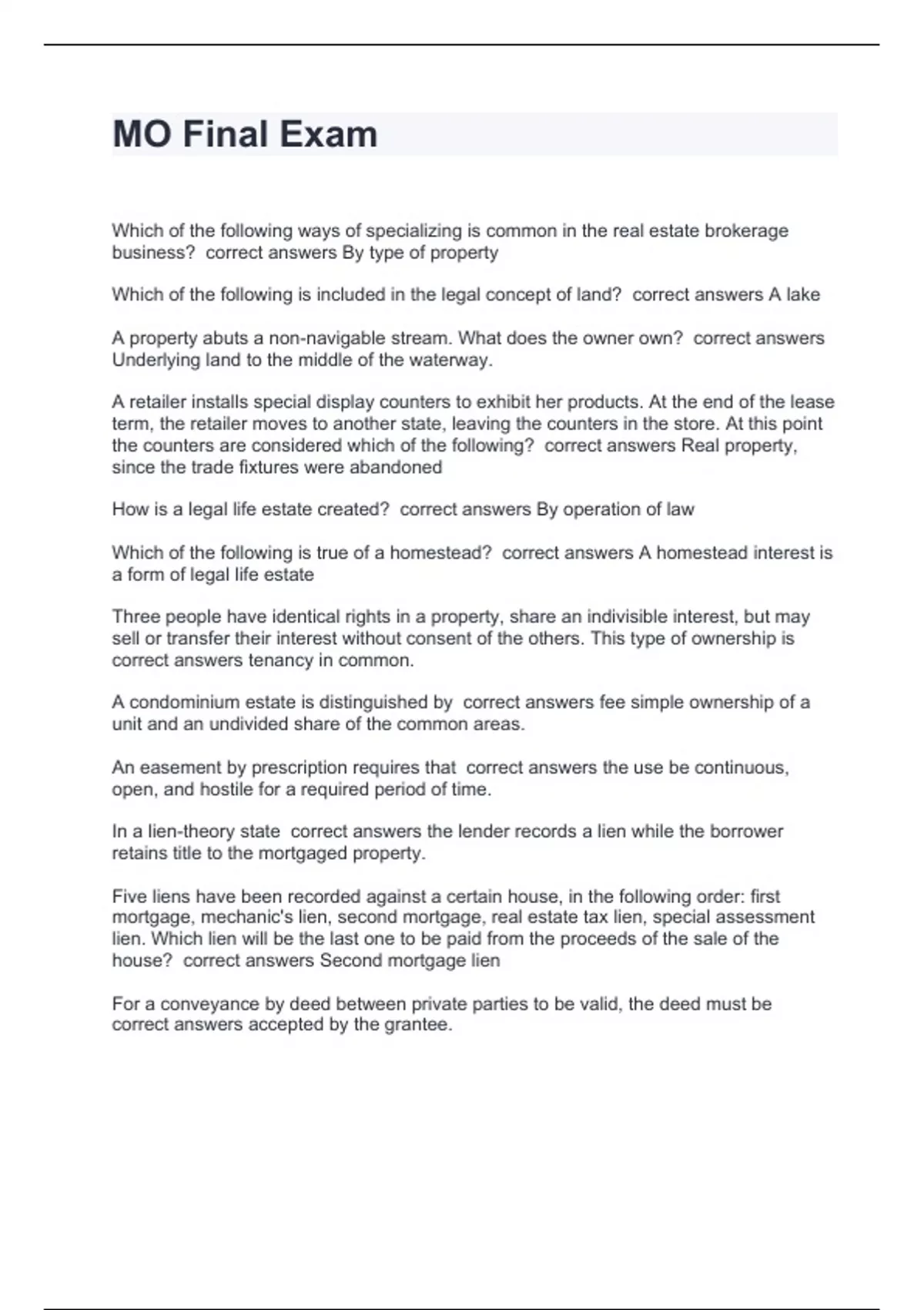 Which of the following ways of specializing is common in the real estate brokerage business? correct answers By type of property Which of the following is included in the legal concept of land? correct answers A lake A property abuts a non-navigable stream. What does the owner own? correct answers Underlying land to the middle of the waterway. A retailer installs special display counters to exhibit her products. At the end of the lease term, the retailer moves to another state, leaving the counters in the store. At this point the counters are considered which of the following? correct answers Real property, since the trade fixtures were abandoned How is a legal life estate created? correct answers By operation of law Which of the following is true of a homestead? correct answers A homestead interest is a form of legal life estate Three people have identical rights in a property, share an indivisible interest, but may sell or transfer their interest without consent of the others. This type of ownership is correct answers tenancy in common. A condominium estate is distinguished by correct answers fee simple ownership of a unit and an undivided share of the common areas. An easement by prescription requires that correct answers the use be continuous, open, and hostile for a required period of time. In a lien-theory state correct answers the lender records a lien while the borrower retains title to the mortgaged property. Five liens have been recorded against a certain house, in the following order: first mortgage, mechanic's lien, second mortgage, real estate tax lien, special assessment lien. Which lien will be the last one to be paid from the proceeds of the sale of the house? correct answers Second mortgage lien For a conveyance by deed between private parties to be valid, the deed must be correct answers accepted by the grantee.