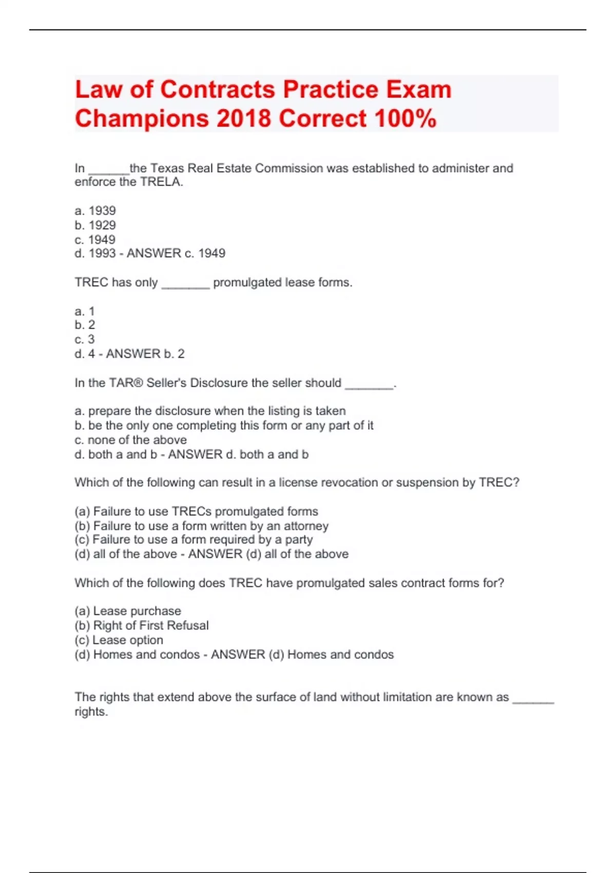 In ______the Texas Real Estate Commission was established to administer and enforce the TRELA. a. 1939 b. 1929 c. 1949 d. 1993 - ANSWER c. 1949 TREC has only _______ promulgated lease forms. a. 1 b. 2 c. 3 d. 4 - ANSWER b. 2 In the TAR® Seller's Disclosure the seller should _______. a. prepare the disclosure when the listing is taken b. be the only one completing this form or any part of it c. none of the above d. both a and b - ANSWER d. both a and b Which of the following can result in a license revocation or suspension by TREC? (a) Failure to use TRECs promulgated forms (b) Failure to use a form written by an attorney (c) Failure to use a form required by a party (d) all of the above - ANSWER (d) all of the above Which of the following does TREC have promulgated sales contract forms for? (a) Lease purchase (b) Right of First Refusal (c) Lease option (d) Homes and condos - ANSWER (d) Homes and condos The rights that extend above the surface of land without limitation are known as ______ rights. (a) improvement