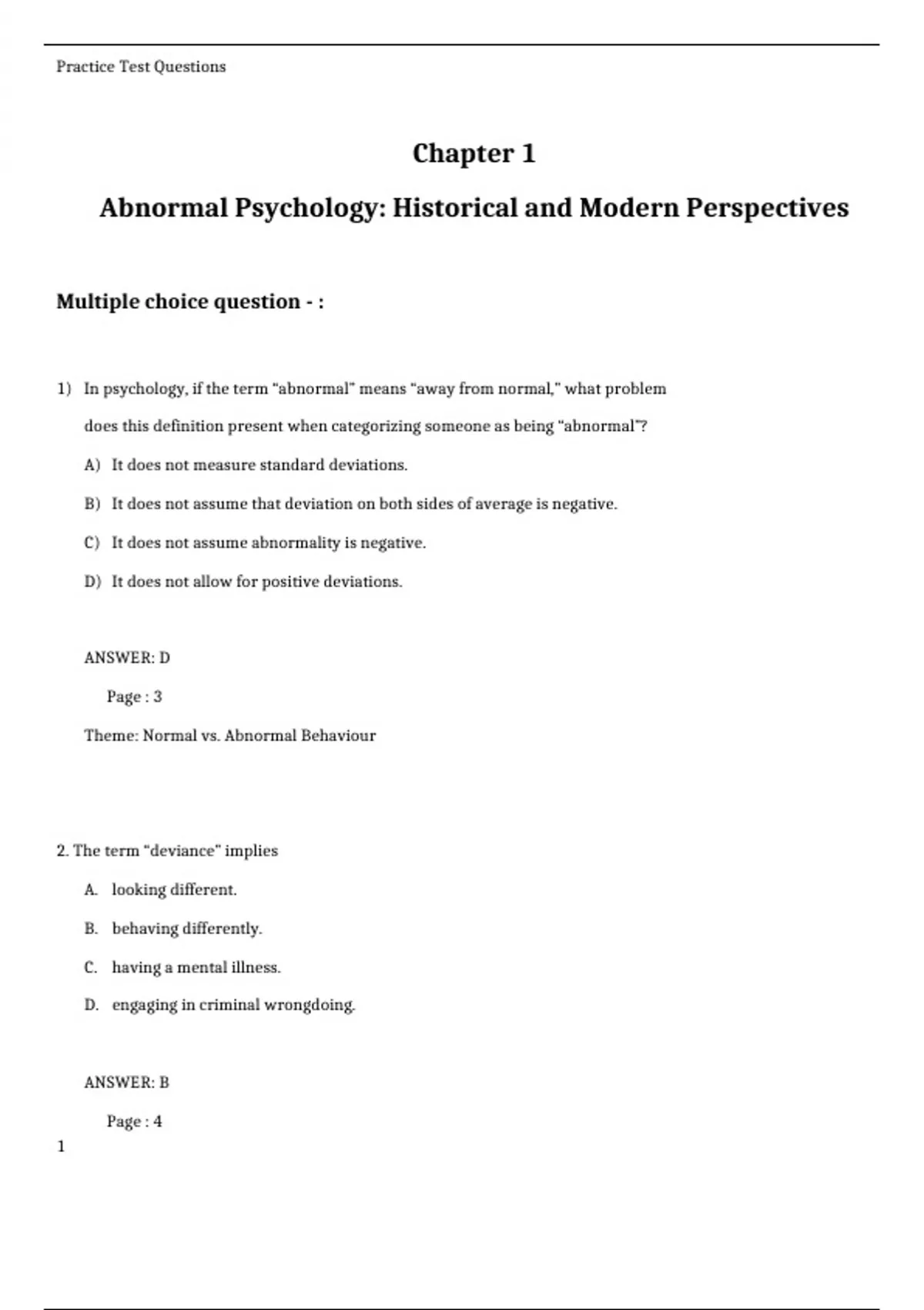 1) In psychology, if the term “abnormal” means “away from normal,” what problem