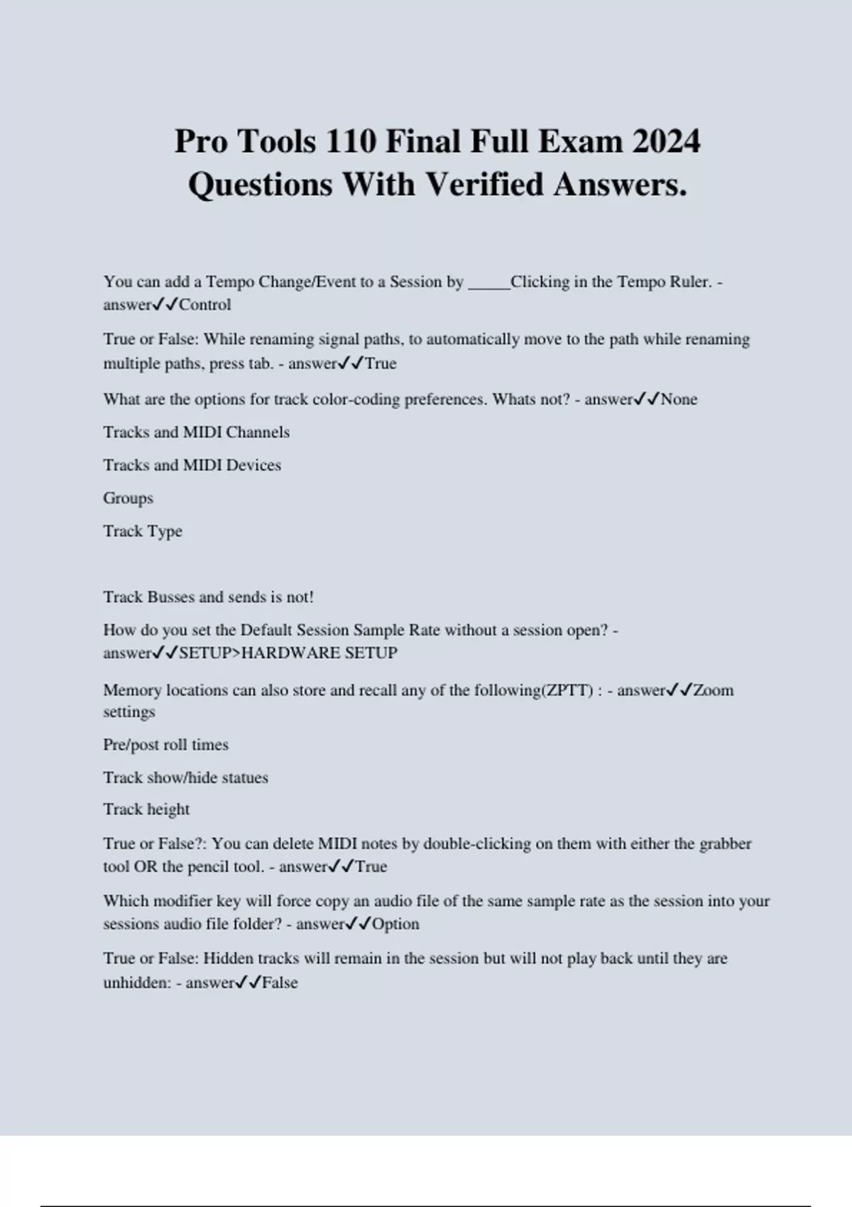 Pro Tools 110 Final Full Exam 2024 Questions With Verified Answers. You can add a Tempo Change/Event to a Session by _____Clicking in the Tempo Ruler. - answerControl True or False: While renaming signal paths, to automatically move to the path while renaming multiple paths, press tab. - answerTrue What are the options for track color-coding preferences. Whats not? - answerNone Tracks and MIDI Channels Tracks and MIDI Devices Groups Track Type Track Busses and sends is not! How do you set the Default Session Sample Rate without a session open? - answerSETUP>HARDWARE SETUP Memory locations can also store and recall any of the following(ZPTT) : - answerZoom settings Pre/post roll times Track show/hide statues Track height True or False?: You can delete MIDI notes by double-clicking on them with either the grabber tool OR the pencil tool. - answerTrue Which modifier key will force copy an audio file of the same sample rate as the session into your sessions audio file folder? - answerOption True or False: Hidden tracks will remain in the session but will not play back until they are unhidden: - answerFalse With the Pencil or Grabber Tool you can _____ Click on an Event Marker to Delete it. - answerOption True or False: In order for Automation Data to be Cut, Copied, or Pasted you must first display an Automation playlist for the Track. - answerFalse What is the shortcut for adding an Ins