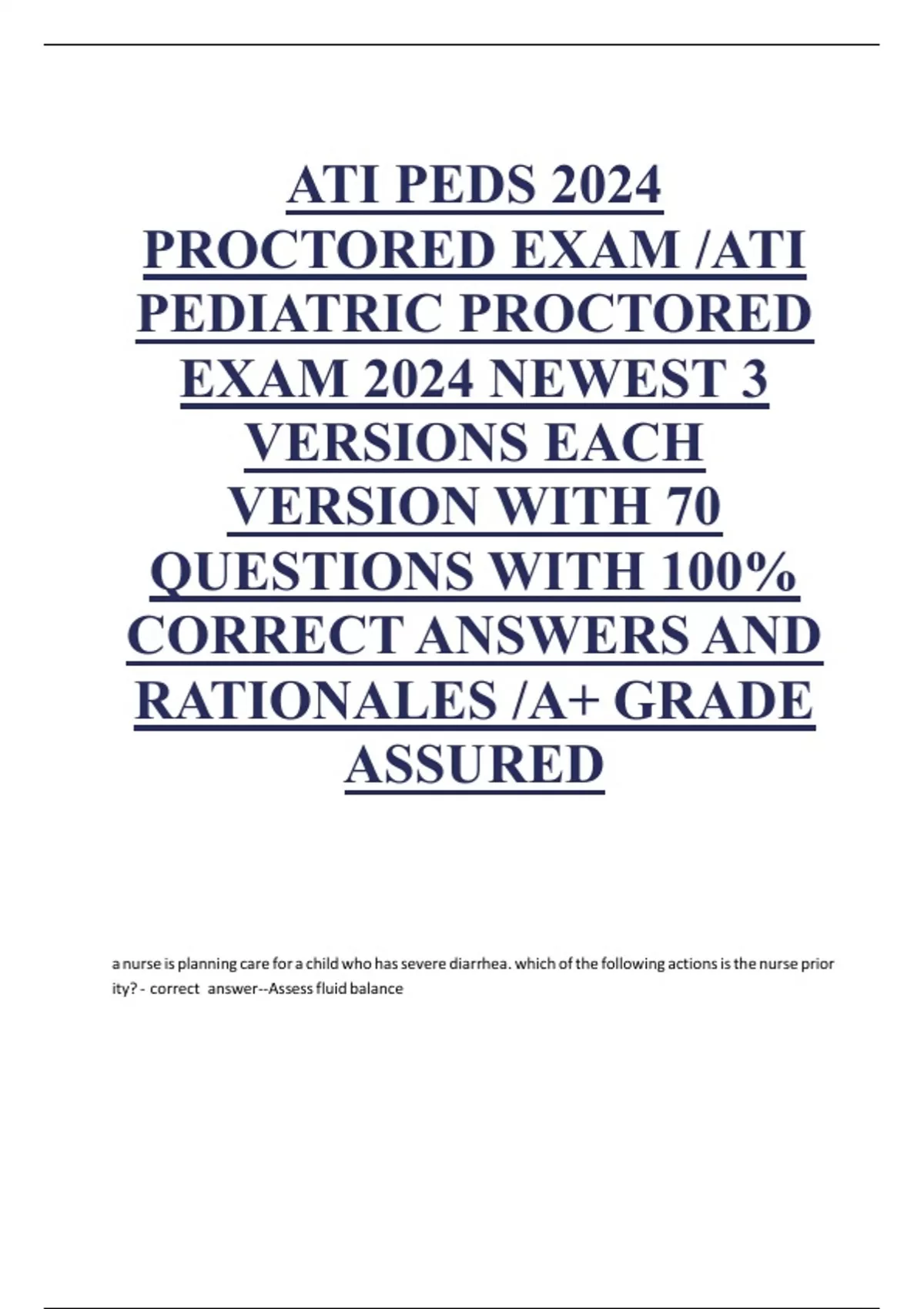 ATI PEDS 2024 PROCTORED EXAM /ATI PEDIATRIC PROCTORED EXAM 2024 NEWEST 3 VERSIONS EACH VERSION WITH 70 QUESTIONS WITH 100% CORRECT ANSWERS AND RATIONALES /A+ GRADE ASSURED