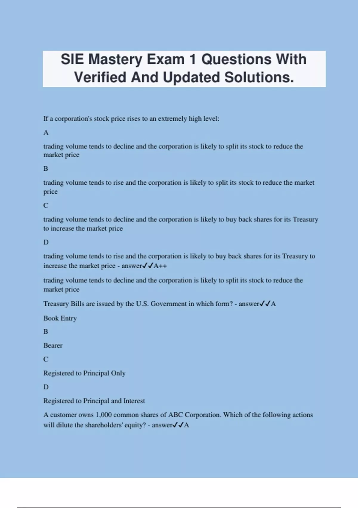 SIE Mastery Exam 1 Questions With Verified And Updated Solutions. If a corporation's stock price rises to an extremely high level: A trading volume tends to decline and the corporation is likely to split its stock to reduce the market price B trading volume tends to rise and the corporation is likely to split its stock to reduce the market price C trading volume tends to decline and the corporation is likely to buy back shares for its Treasury to increase the market price D trading volume tends to rise and the corporation is likely to buy back shares for its Treasury to increase the market price - answerA++ trading volume tends to decline and the corporation is likely to split its stock to reduce the market price Treasury Bills are issued by the U.S. Government in which form? - answerA Book Entry B Bearer C Registered to Principal Only D Registered to Principal and Interest A customer owns 1,000 common shares of ABC Corporation. Which of the following actions will dilute the shareholders' equity? - answerA ABC declares a 5% stock dividend B++ ABC declares that it will call its convertible preferred stock, which is currently trading at a premium C ABC declares that it will issue an additional $100,000,000 in bonds D ABC declares a 4:1 stock split The market price of common stock will be influenced by which of the following? - answerA The par value of the shares B ++Expectations for future earnings growth C Date of incorporation for the issuer D Book value of the company A customer buys 100 shares of XYZ stock at $40. The stock pays a quarterly dividend of $.50. What is the dividend yield? A 1% B 1.25% C 4% D 5% - answerD++ 5% ABC Company has issued 8%, $100 par, cumulative preferred stock. Two years ago, ABC paid a 4% preferred dividend. Last year, ABC paid a 5% preferred stock dividend. This year, ABC wishes to pay a common dividend. If the preferred stock is now trading at $94, a customer who owns 100 shares of the company's preferred stock will receive: A $700 B $800 C $1,000 D $1,500 - answerD $1,500 Which statement is BEST regarding participating preferred stock? A The dividend rate is fixed B The dividend rate varies depending on the decision of the Board of Directors C The dividend rate is fixed as to maximum but not as to minimum D The dividend rate is fixed as to minimum but not as to maximum - answerD++ The dividend rate is fixed as to minimum but not as to maximum A middle-aged widowed customer has an investment objective of stable income and would also like to receive occasional "extra" income to help pay unexpected bills. What type of preferred stock would be the best recommendation? A Participating preferred B Convertible preferred C