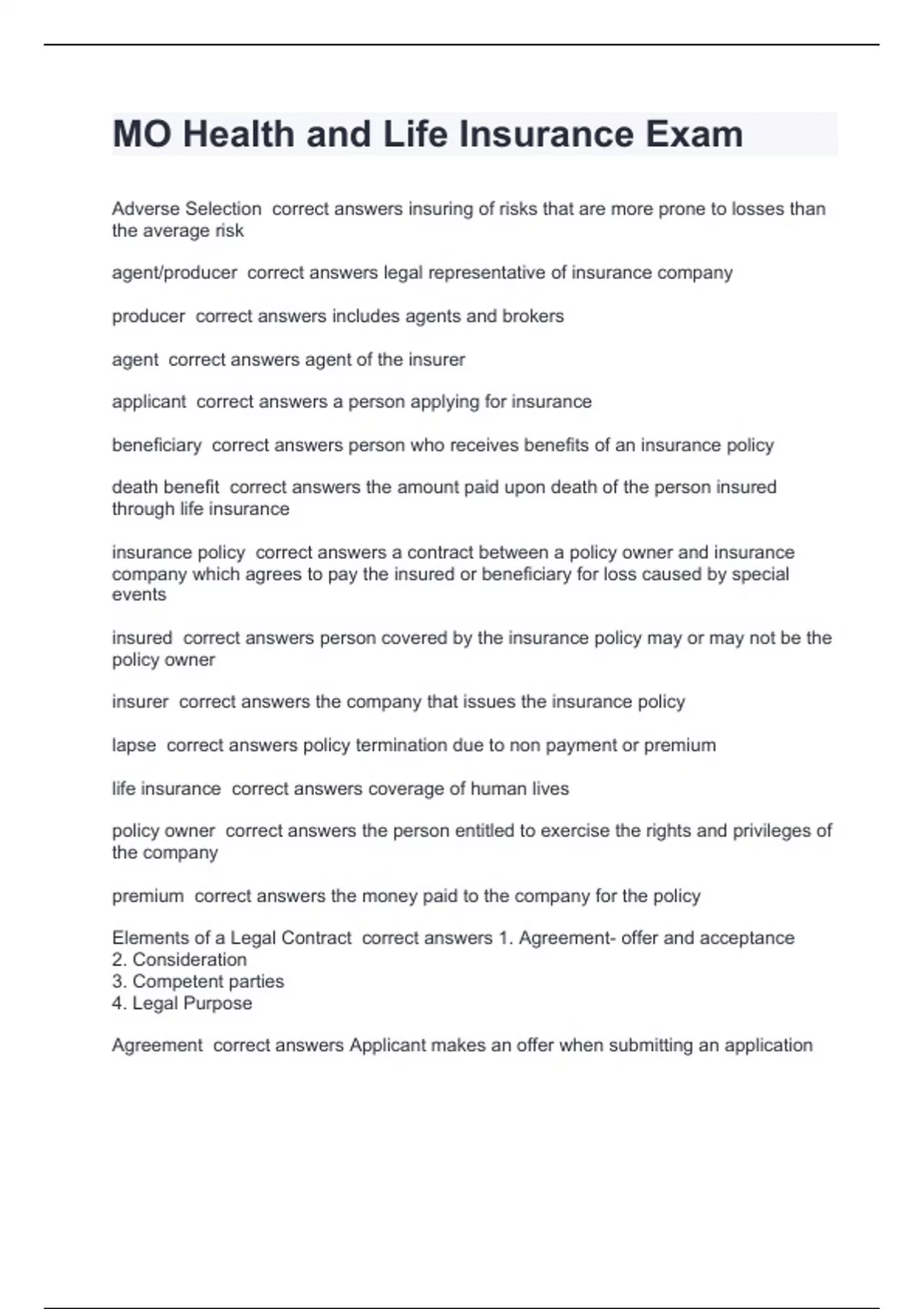 Adverse Selection correct answers insuring of risks that are more prone to losses than the average risk agent/producer correct answers legal representative of insurance company producer correct answers includes agents and brokers agent correct answers agent of the insurer applicant correct answers a person applying for insurance beneficiary correct answers person who receives benefits of an insurance policy death benefit correct answers the amount paid upon death of the person insured through life insurance insurance policy correct answers a contract between a policy owner and insurance company which agrees to pay the insured or beneficiary for loss caused by special events insured correct answers person covered by the insurance policy may or may not be the policy owner insurer correct answers the company that issues the insurance policy lapse correct answers policy termination due to non payment or premium life insurance correct answers coverage of human lives policy owner correct answers the person entitled to exercise the rights and privileges of the company premium correct answers the money paid to the company for the policy Elements of a Legal Contract correct answers 1. Agreement- offer and acceptance 2. Consideration 3. Competent parties 4. Legal Purpose Agreement correct answers Applicant makes an offer when submitting an application