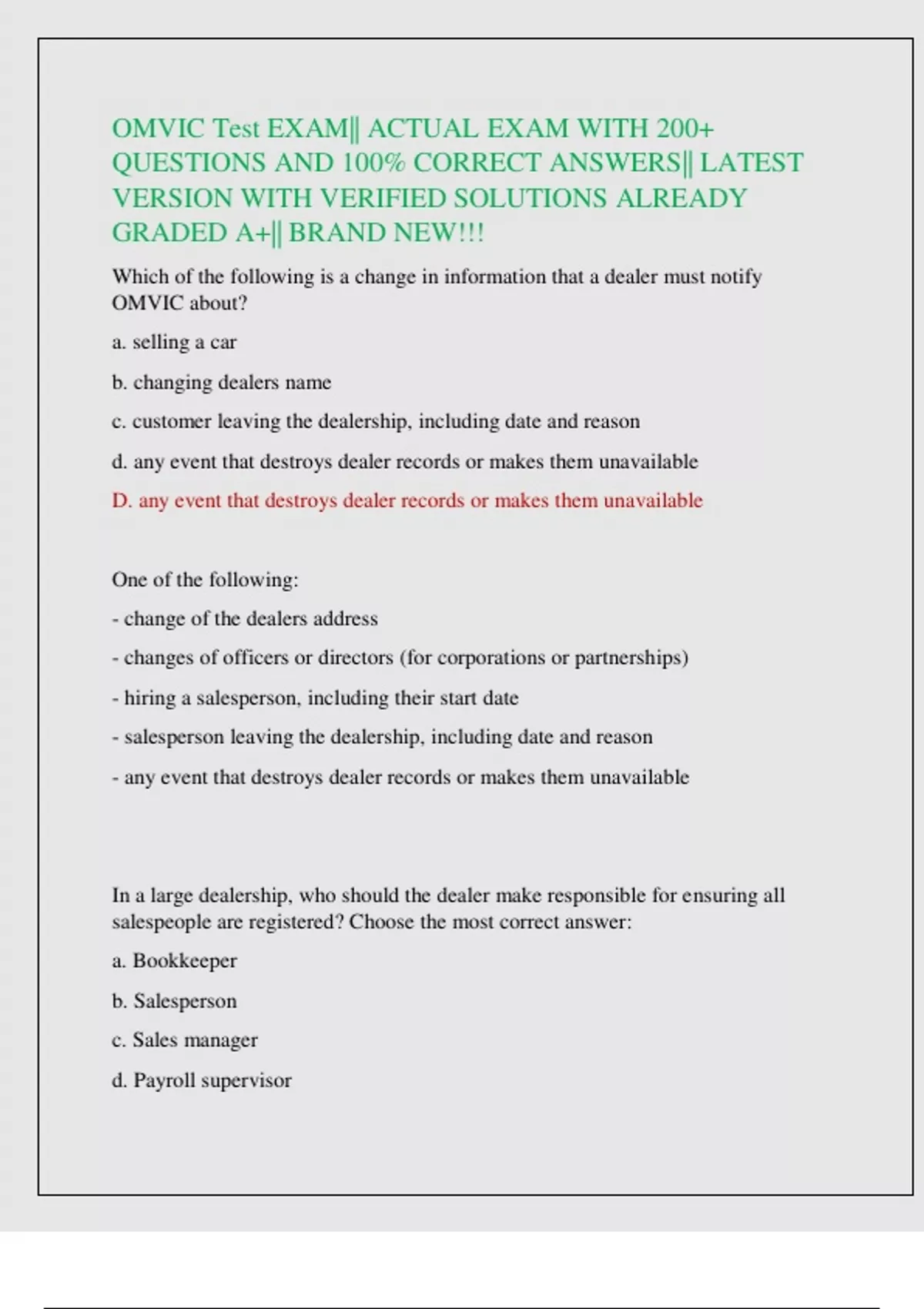 OMVIC Test EXAM|| ACTUAL EXAM WITH 200+ QUESTIONS AND 100% CORRECT ANSWERS|| LATEST VERSION WITH VERIFIED SOLUTIONS ALREADY GRADED A+|| BRAND NEW!!!