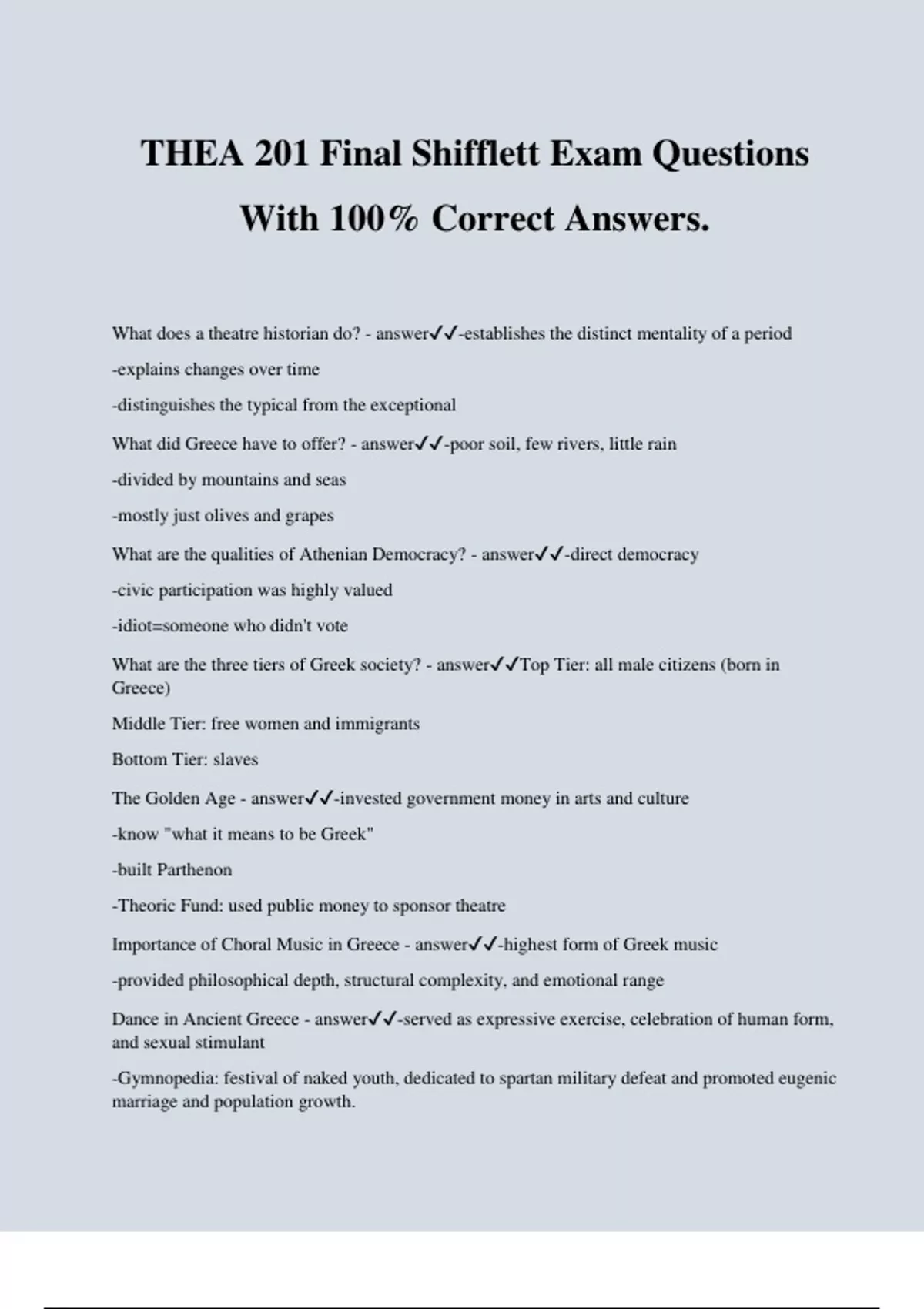 THEA 201 Final Shifflett Exam Questions With 100% Correct Answers. What does a theatre historian do? - answer-establishes the distinct mentality of a period -explains changes over time -distinguishes the typical from the exceptional What did Greece have to offer? - answer-poor soil, few rivers, little rain -divided by mountains and seas -mostly just olives and grapes What are the qualities of Athenian Democracy? - answer-direct democracy -civic participation was highly valued -idiot=someone who didn't vote What are the three tiers of Greek society? - answerTop Tier: all male citizens (born in Greece) Middle Tier: free women and immigrants Bottom Tier: slaves The Golden Age - answer-invested government money in arts and culture -know "what it means to be Greek" -built Parthenon -Theoric Fund: used public money to sponsor theatre Importance of Choral Music in Greece - answer-highest form of Greek music -provided philosophical depth, structural complexity, and emotional range Dance in Ancient Greece - answer-served as expressive exercise, celebration of human form, and sexual stimulant -Gymnopedia: festival of naked youth, dedicated to spartan military defeat and promoted eugenic marriage and population growth. Dionysus - answerGreek god of wine, drunkenness, sex, fertility, and theatre Dithyrambs - answer-Dionysian festival of choric hymns , many which tell stories -Thespis steps out of the chorus and impersonates characters -thespians=followers of Thespis -call and response / back and forth with chorus Annual Play Competition - answer-held in Dionysia -competition between 4 playwrights -each turned in 3 tragedies and 1 satyr play Qualities of Acting in Greek Theatre - answer-always 3 actors -actors were always men and wore masks made of cork -the chorus was filled with amateurs. they danced, sang, and commented on the action taking place. What is the Greek word for someone uninterested in politics? - answeridiot Who was the Greek leader celebrated for investing money in cultural projects? - answerPericles Chronological order of the Development of Greek Theatre - answer1. Worshippers celebrate the God Dionysus through unrestrained festivals that involved a frenzied "possession" by the god 2. Worshippers celebrate the god Dionysus through structured festivals including the performance of long choric hymns 3. A masked actor (possible named Thespis) begins impersonating characters and engages in a call-and-response with the chorus 4. The City Dionysia is established as an annual competition of tragedies. 5. Comedies become a category for competition at the city dionysia Aeschylus - answer-introduced the second actor -reduced the chorus to 12 people -known for stately poetic language Sophocles - answer-wrote in a conversational tone -won The City Dionysia more times than anyone else -best remembered for plays about Oedipus's family