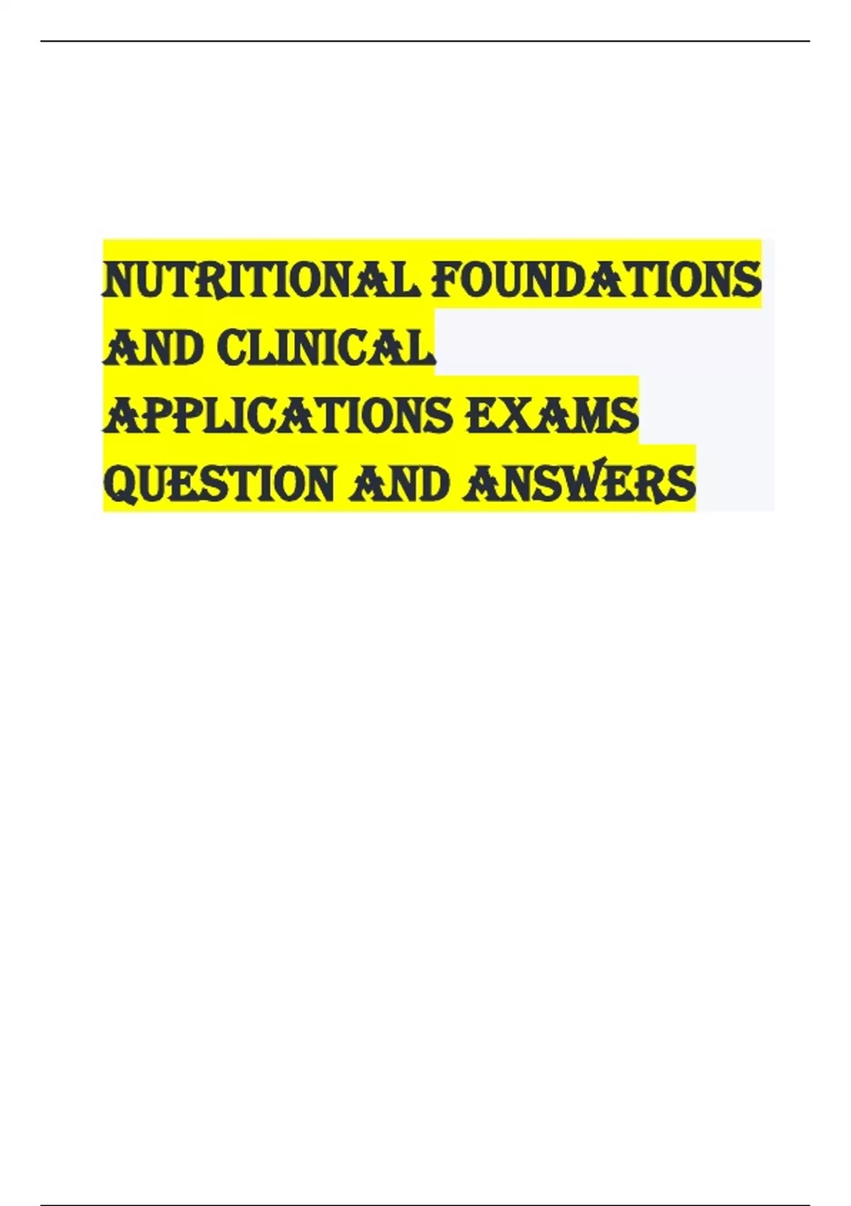 Nutritional Foundations and Clinical Applications EXAMS QUESTION AND ANSWERS Recommended Dietary Allowance (RDA) - correct answerthe average daily amount of a nutrient considered adequate to meet the known nutrient needs of practically all healthy people; a goal for dietary intake by individuals Adequate Intake (AI) - correct answera recommended average daily nutrient intake level based on observed or experimentally determined estimates of nutrient intake by a group of healthy people Tolerable Upper Intake Level (UL) - correct answerthe highest average daily nutrient intake level likely to pose no risk of adverse health effects to almost all individuals in a particular life stage and gender group Acceptable Macronutrient Distribution Range (AMDR) - correct answerdaily percentage energy intake values for the macronutrients fat, carbohydrate, and protein -45%-65% of kcal intake from carbs -20%-35% of kcal intake from fat -10%-35% of kcal intake from protein Estimated Energy Requirement (EER) - correct answerthe average dietary energy intake that maintains energy balance and good health in a person of a given age, gender, weight, height, and level of physical activity undernutrition - correct answernot consuming enough energy or nutrients compared with DRI values overnutrition - correct answerthe consumption of too many nutrients and too much energy compared to DRI values malnutrition - correct answercondition resulting from an imbalanced nutrient and/or energy intake. can be both overnutrition or undernutrition self efficacy - correct answerpositive self efficacy: believing that personal behaviors can be changed and one has control over one's life negative: feeling that one is powerless with little control over circumstances Chapter 1 - correct answerWellness Nutrition nutrients - correct answerSubstances in food that your body needs to grow, to repair itself, and to supply you with energy types of health - correct answer-physical (maintain bodily function) -intellectual (to learn and adapt to changes in ones environment) -emotional (ability to express/suppress our emotions appropriately) -social (ability to interact with people in an acceptable manner) -spiritual (cultural beliefs that give purpose to human life) -environmental (physical context of where one lives or works, determined by ethnicity, education, income, occupation) health promotion - correct answerconsists of strategies used to raise the level of the health of individuals, families, groups, and communities primary prevention - correct answeractivities that avert the initial development of disease or poor health tertiary prevention - correct answeroccurs after a disorder develops. The purpose is to minimize further complications or to assist in the restoration of health. secondary prevention - correct answerinvolves early detection to halt or reduce the effects of a disease or illness Health literacy - correct answera person's capacity to learn about and understand basic health information and services, and to use these resources to promote one's health and wellness the 6 nutrient categories - correct answercarbohydrates proteins lipids vitamins minerals water