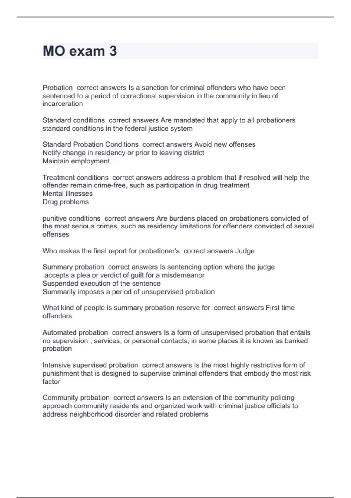 Probation correct answers Is a sanction for criminal offenders who have been sentenced to a period of correctional supervision in the community in lieu of incarceration Standard conditions correct answers Are mandated that apply to all probationers standard conditions in the federal justice system Standard Probation Conditions correct answers Avoid new offenses Notify change in residency or prior to leaving district Maintain employment Treatment conditions correct answers address a problem that if resolved will help the offender remain crime-free, such as participation in drug treatment Mental illnesses Drug problems punitive conditions correct answers Are burdens placed on probationers convicted of the most serious crimes, such as residency limitations for offenders convicted of sexual offenses Who makes the final report for probationer's correct answers Judge Summary probation correct answers Is sentencing option where the judge accepts a plea or verdict of guilt for a misdemeanor Suspended execution of the sentence Summarily imposes a period of unsupervised probation What kind of people is summary probation reserve for correct answers First time offenders Automated probation correct answers Is a form of unsupervised probation that entails no supervision , services, or personal contacts, in some places it is known as banked probation Intensive supervised probation correct answers Is the most highly restrictive form of punishment that is designed to supervise criminal offenders that embody the most risk factor Community probation correct answers Is an extension of the community policing approach community residents and organized work with criminal justice officials to address neighborhood disorder and related problems