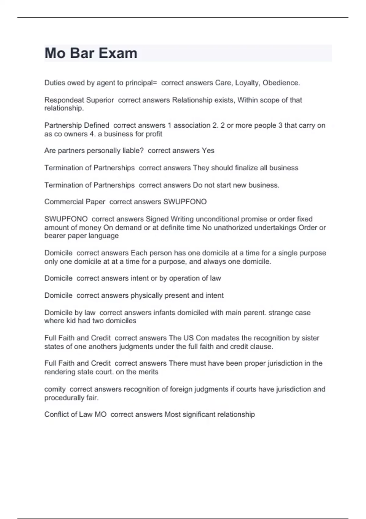 Duties owed by agent to principal= correct answers Care, Loyalty, Obedience. Respondeat Superior correct answers Relationship exists, Within scope of that relationship. Partnership Defined correct answers 1 association 2. 2 or more people 3 that carry on as co owners 4. a business for profit Are partners personally liable? correct answers Yes Termination of Partnerships correct answers They should finalize all business Termination of Partnerships correct answers Do not start new business. Commercial Paper correct answers SWUPFONO SWUPFONO correct answers Signed Writing unconditional promise or order fixed amount of money On demand or at definite time No unathorized undertakings Order or bearer paper language Domicile correct answers Each person has one domicile at a time for a single purpose only one domicile at at a time for a purpose, and always one domicile. Domicile correct answers intent or by operation of law Domicile correct answers physically present and intent Domicile by law correct answers infants domiciled with main parent. strange case where kid had two domiciles Full Faith and Credit correct answers The US Con madates the recognition by sister states of one anothers judgments under the full faith and credit clause. Full Faith and Credit correct answers There must have been proper jurisdiction in the rendering state court. on the merits comity correct answers recognition of foreign judgments if courts have jurisdiction and procedurally fair. Conflict of Law MO correct answers Most significant relationship