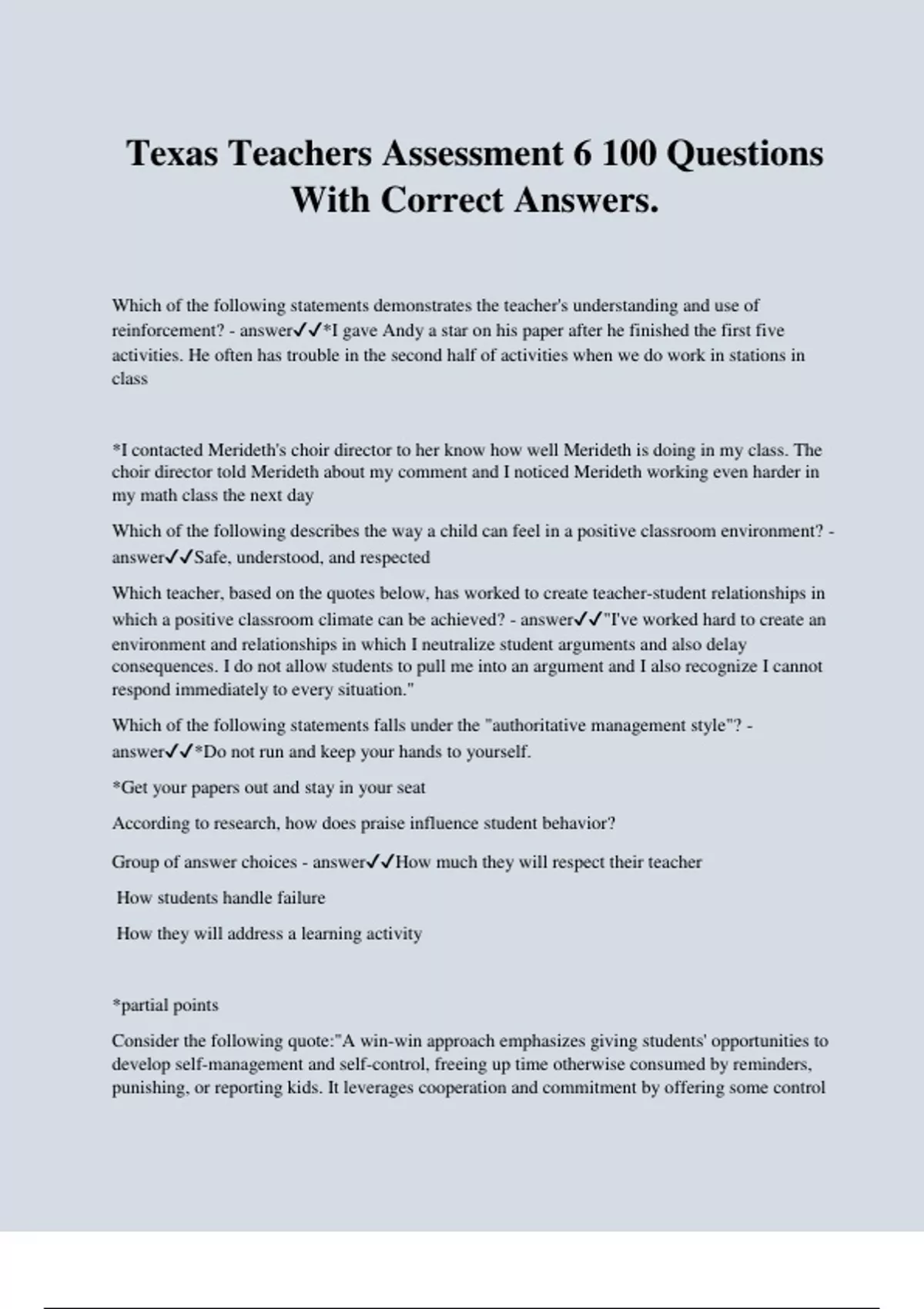 Texas Teachers Assessment 6 100 Questions With Correct Answers. Which of the following statements demonstrates the teacher's understanding and use of reinforcement? - answer*I gave Andy a star on his paper after he finished the first five activities. He often has trouble in the second half of activities when we do work in stations in class *I contacted Merideth's choir director to her know how well Merideth is doing in my class. The choir director told Merideth about my comment and I noticed Merideth working even harder in my math class the next day Which of the following describes the way a child can feel in a positive classroom environment? - answerSafe, understood, and respected Which teacher, based on the quotes below, has worked to create teacher-student relationships in which a positive classroom climate can be achieved? - answer"I've worked hard to create an environment and relationships in which I neutralize student arguments and also delay consequences. I do not allow students to pull me into an argument and I also recognize I cannot respond immediately to every situation." Which of the following statements falls under the "authoritative management style"? - answer*Do not run and keep your hands to yourself. *Get your papers out and stay in your seat According to research, how does praise influence student behavior? Group of answer choices - answerHow much they will respect their teacher How students handle failure How they will address a learning activity *partial points Consider the following quote:"A win-win approach emphasizes giving students' opportunities to develop self-management and self-control, freeing up time otherwise consumed by reminders, punishing, or reporting kids. It leverages cooperation and commitment by offering some control and autonomy within a structure that protects the teacher's ability to teach and the students' ability to learn."(Bluestein, 2011)Which teacher below adheres to this philosophy in her classroom? - answer"In my classroom I am very conscious of developing my students' unique talents and never comparing them to one another." According to researchers Fay and Funk there are "gold and garbage" statements used by teachers in classrooms. A gold statement is one that is an enforceable statement and gives the students choice. From the list below, choose the gold statements: - answer*I'll dismiss the class for lunch once all notebooks are put away neatly *I'll give full credit to labs completed on time and partial credit to those turned in late Why, according to Bob Sornson, is empathy preferable to sympathy when working with students to build a positive classroom environment? - answerEmpathy from teachers allows students to feel as though they are understood. According to Fred Jones, "Proactive management is more than a set of procedures. It is a mindset. It is the way a person thinks when success is not negotiable, and it just happens to be easier in the long run." (Jones 2007) Which of the following teachers takes a proactive mindset? - answer"I've set up a learning environment where students know as they arrive they are to get their notebooks, sharpen their pencil, take their seat, and begin working on the warm up before the tardy bell rings." Which of the following are benefits to giving children decision making authority in the classroom? - answer*They learn how to be self-determining learners. *They learn how to make good decisions about their learning. *They feel invested in the task(s) or project(s) of the classroom. When developing a classroom management plan, which of the following should be a priority according to Rick Smith and Mary Lambert? - answerSafety and structure How does a strong classroom management plan allow for the teaching and learning of content? - answerClassroom management gives students the structure they need in order to engage in academic lessons. When considering a classroom management plan for any age of students, what type of plan should a new teacher develop? - answerTeachers should create a management plan that prevents student behavior issues. Of the statements below, which best supports the idea of group management and group focus? - answerIn my classroom I prefer to manage behaviors through active participation and holding all students accountable. I use a "popsicle stick randomizer" and draw names so students never know who will be called on next.
