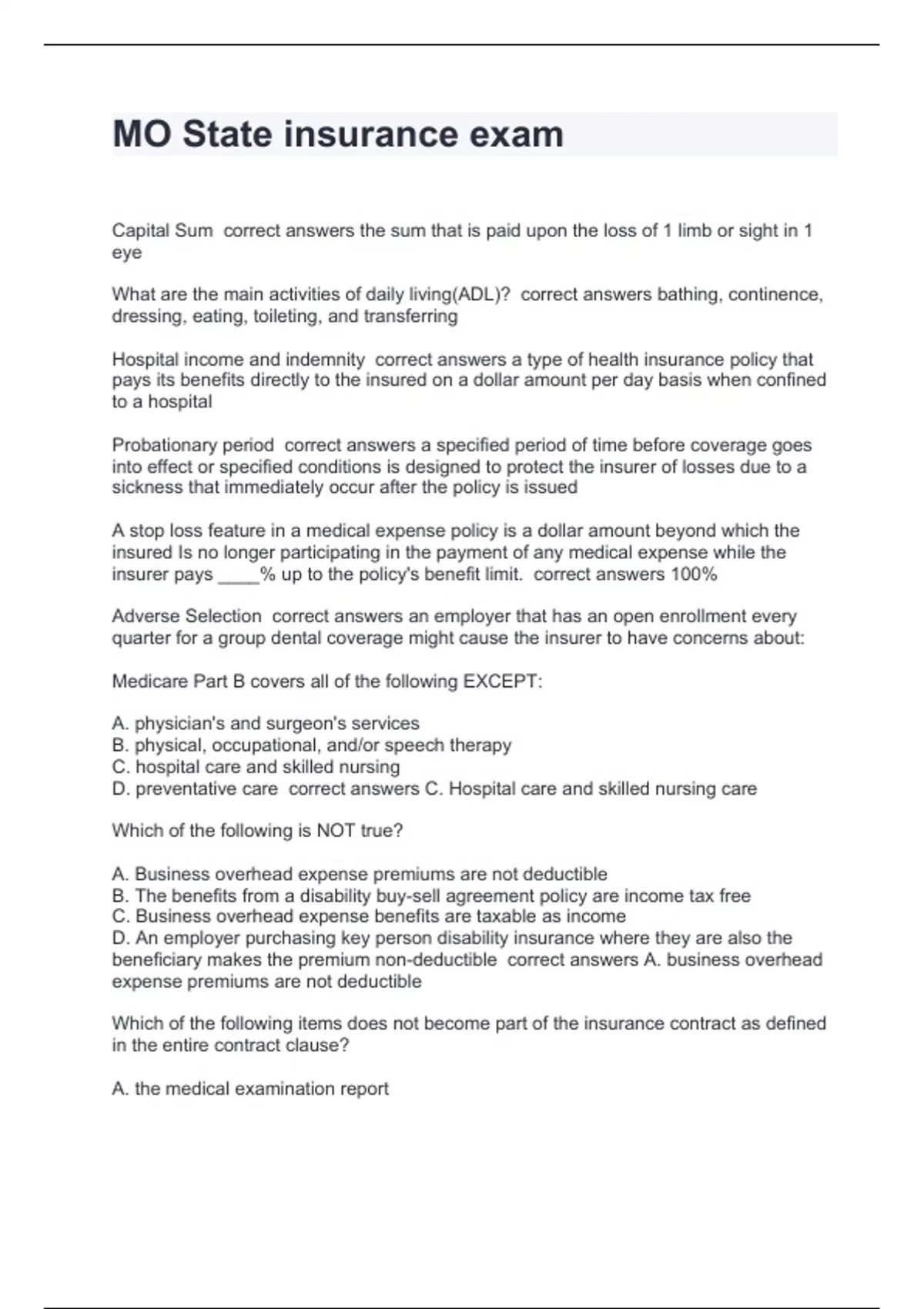 Capital Sum correct answers the sum that is paid upon the loss of 1 limb or sight in 1 eye What are the main activities of daily living(ADL)? correct answers bathing, continence, dressing, eating, toileting, and transferring Hospital income and indemnity correct answers a type of health insurance policy that pays its benefits directly to the insured on a dollar amount per day basis when confined to a hospital Probationary period correct answers a specified period of time before coverage goes into effect or specified conditions is designed to protect the insurer of losses due to a sickness that immediately occur after the policy is issued A stop loss feature in a medical expense policy is a dollar amount beyond which the insured Is no longer participating in the payment of any medical expense while the insurer pays ____% up to the policy's benefit limit. correct answers 100% Adverse Selection correct answers an employer that has an open enrollment every quarter for a group dental coverage might cause the insurer to have concerns about: Medicare Part B covers all of the following EXCEPT: A. physician's and surgeon's services B. physical, occupational, and/or speech therapy C. hospital care and skilled nursing D. preventative care correct answers C. Hospital care and skilled nursing care Which of the following is NOT true? A. Business overhead expense premiums are not deductible B. The benefits from a disability buy-sell agreement policy are income tax free C. Business overhead expense benefits are taxable as income D. An employer purchasing key person disability insurance where they are also the beneficiary makes the premium non-deductible correct answers A. business overhead expense premiums are not deductible Which of the following items does not become part of the insurance contract as defined in the entire contract clause? A. the medical examination report