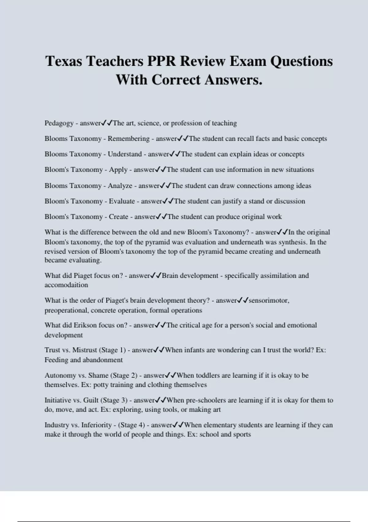 Texas Teachers PPR Review Exam Questions With Correct Answers. Pedagogy - answerThe art, science, or profession of teaching Blooms Taxonomy - Remembering - answerThe student can recall facts and basic concepts Blooms Taxonomy - Understand - answerThe student can explain ideas or concepts Bloom's Taxonomy - Apply - answerThe student can use information in new situations Blooms Taxonomy - Analyze - answerThe student can draw connections among ideas Bloom's Taxonomy - Evaluate - answerThe student can justify a stand or discussion Bloom's Taxonomy - Create - answerThe student can produce original work What is the difference between the old and new Bloom's Taxonomy? - answerIn the original Bloom's taxonomy, the top of the pyramid was evaluation and underneath was synthesis. In the revised version of Bloom's taxonomy the top of the pyramid became creating and underneath became evaluating. What did Piaget focus on? - answerBrain development - specifically assimilation and accomodaition What is the order of Piaget's brain development theory? - answersensorimotor, preoperational, concrete operation, formal operations What did Erikson focus on? - answerThe critical age for a person's social and emotional development Trust vs. Mistrust (Stage 1) - answerWhen infants are wondering can I trust the world? Ex: Feeding and abandonment Autonomy vs. Shame (Stage 2) - answerWhen toddlers are learning if it is okay to be themselves. Ex: potty training and clothing themselves Initiative vs. Guilt (Stage 3) - answerWhen pre-schoolers are learning if it is okay for them to do, move, and act. Ex: exploring, using tools, or making art Industry vs. Inferiority - (Stage 4) - answerWhen elementary students are learning if they can make it through the world of people and things. Ex: school and sports