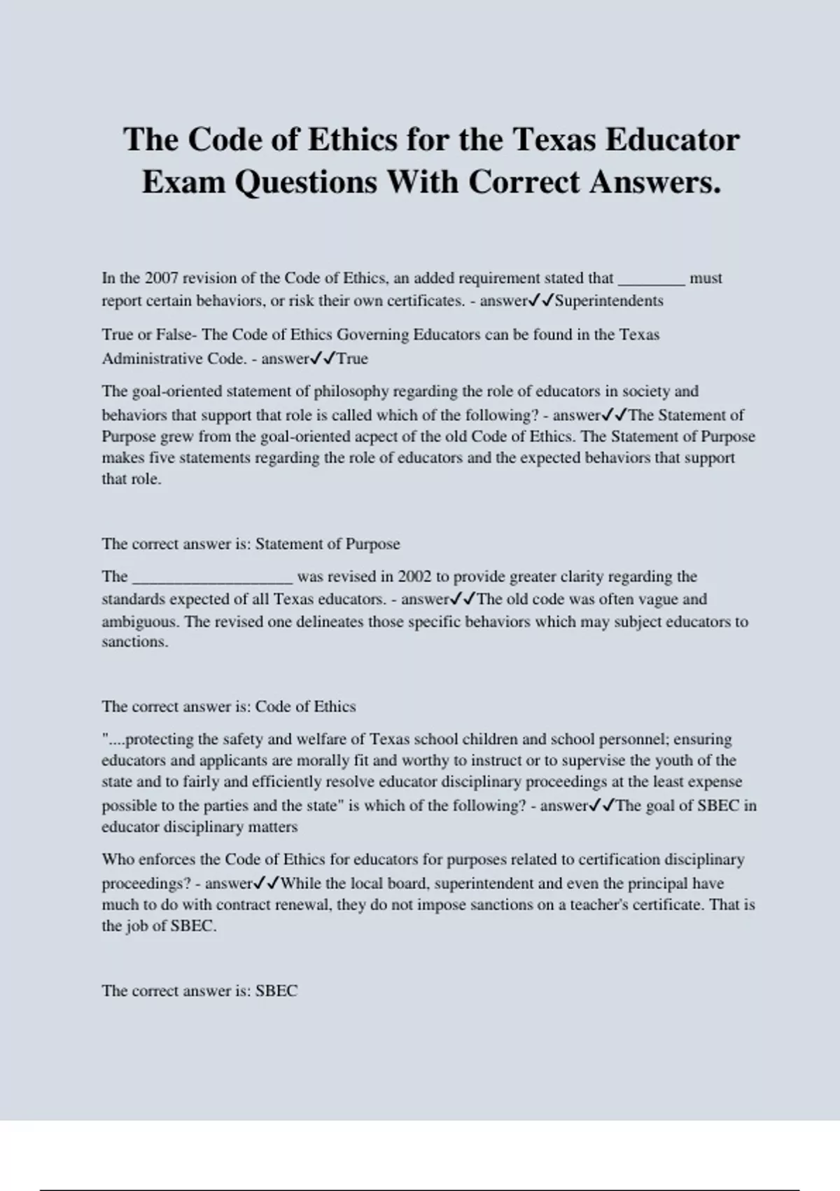 The Code of Ethics for the Texas Educator Exam Questions With Correct Answers.