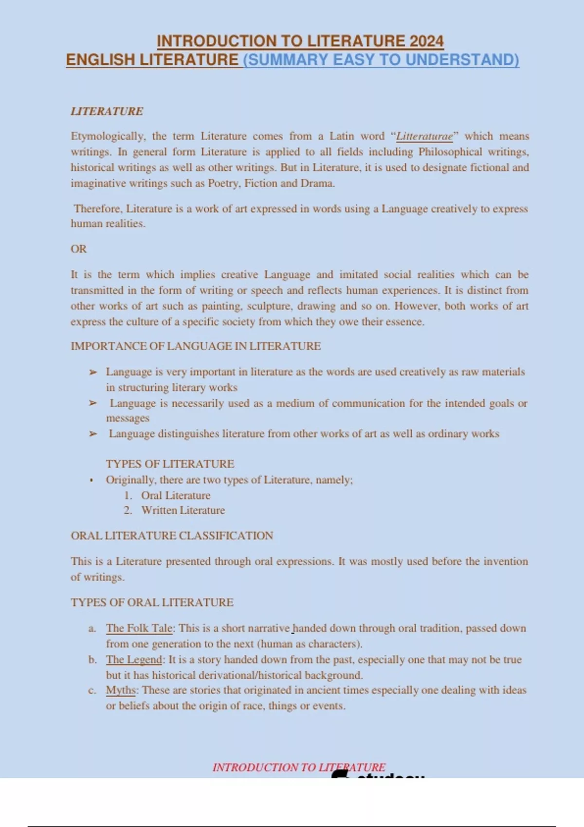 INTRODUCTION TO LITERATURE 2024 ENGLISH LITERATURE (SUMMARY EASY TO UNDERSTAND)