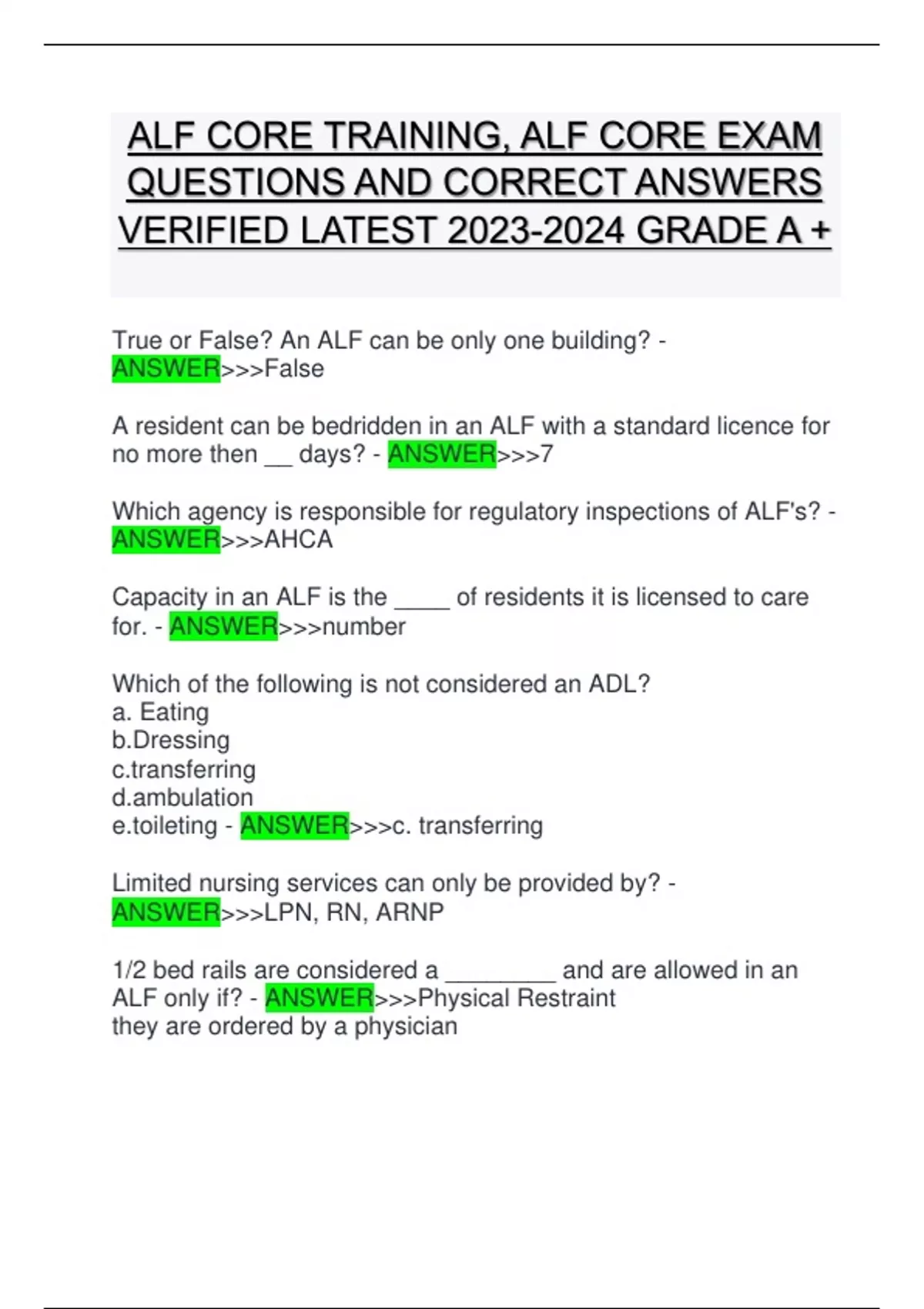 ALF CORE TRAINING, ALF CORE EXAM QUESTIONS AND CORRECT ANSWERS VERIFIED LATEST GRADE A + ALF CORE TRAINING, ALF CORE EXAM QUESTIONS AND CORRECT ANSWERS VERIFIED LATEST GRADE A +