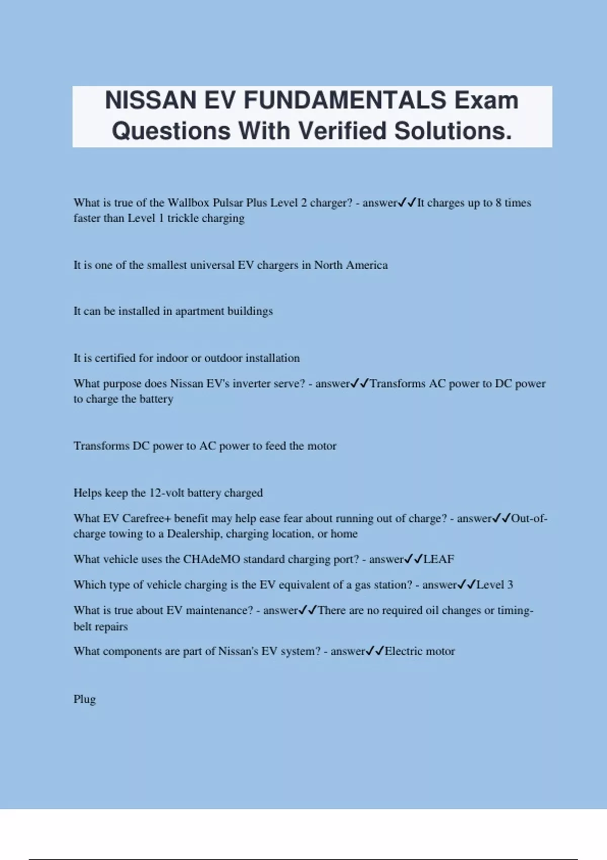 NISSAN EV FUNDAMENTALS Exam Questions With Verified Solutions. What is true of the Wallbox Pulsar Plus Level 2 charger? - answerIt charges up to 8 times faster than Level 1 trickle charging It is one of the smallest universal EV chargers in North America It can be installed in apartment buildings It is certified for indoor or outdoor installation What purpose does Nissan EV's inverter serve? - answerTransforms AC power to DC power to charge the battery Transforms DC power to AC power to feed the motor Helps keep the 12-volt battery charged What EV Carefree+ benefit may help ease fear about running out of charge? - answerOut-of- charge towing to a Dealership, charging location, or home What vehicle uses the CHAdeMO standard charging port? - answerLEAF Which type of vehicle charging is the EV equivalent of a gas station? - answerLevel 3 What is true about EV maintenance? - answerThere are no required oil changes or timing- belt repairs What components are part of Nissan's EV sys