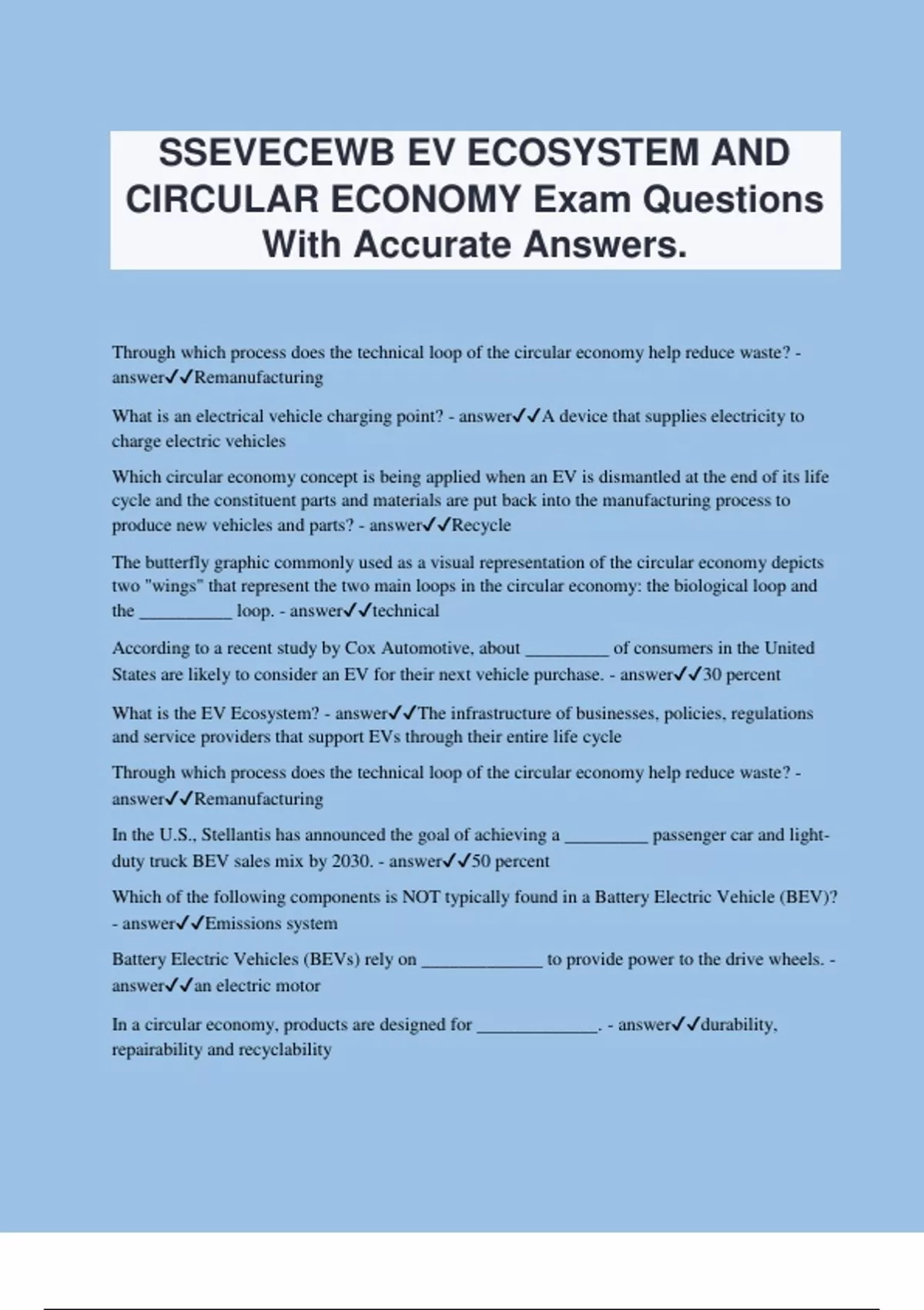 SSEVECEWB EV ECOSYSTEM AND CIRCULAR ECONOMY Exam Questions With Accurate Answers.