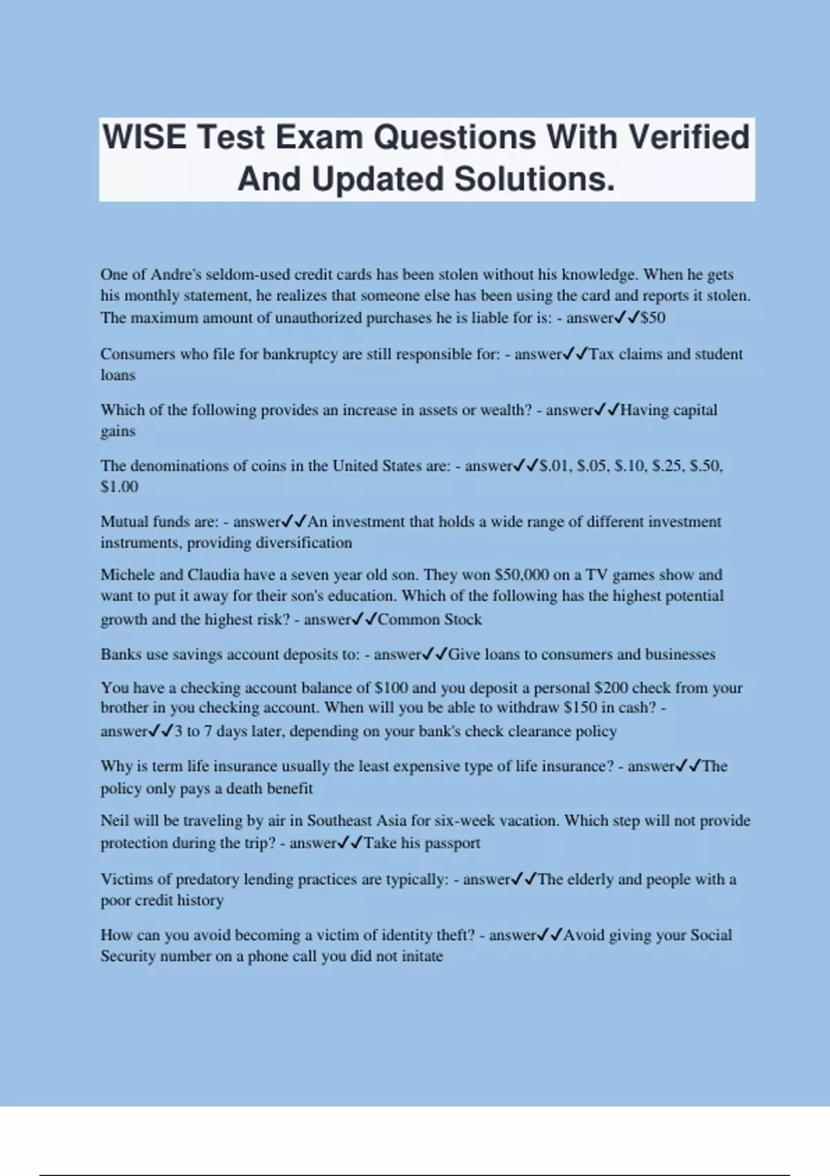 WISE Test Exam Questions With Verified And Updated Solutions. One of Andre's seldom-used credit cards has been stolen without his knowledge. When he gets his monthly statement, he realizes that someone else has been using the card and reports it stolen. The maximum amount of unauthorized purchases he is liable for is: - answer$50 Consumers who file for bankruptcy are still responsible for: - answerTax claims and student loans Which of the following provides an increase in assets or wealth? - answerHaving capital gains The denominations of coins in the United States are: - answer$.01, $.05, $.10, $.25, $.50, $1.00 Mutual funds are: - answerAn investment that holds a wide range of different investment instruments, providing diversification Michele and Claudia have a seven year old son. They won $50,000 on a TV games show and want to put it away for their son's education. Which of the following has the highest potential growth and the highest risk? - answerCommon Stock Banks use savings account deposits to: - answerGive loans to consumers and businesses You have a checking account balance of $100 and you deposit a personal $200 check from your brother in you checking account. When will you be able to withdraw $150 in cash? - answer3 to 7 days later, depending on your bank's check clearance policy Why is term life insurance usually the least expensive type of life insurance? - answerThe policy only pays a death benefit Neil will be traveling by air in Southeast Asia for six-week vacation. Which step will not provide protection during the trip? - answerTake his passport Victims of predatory lending practices are typically: - answerThe elderly and people with a poor credit history How can you avoid becoming a victim of identity theft? - answerAvoid giving your Social Security number on a phone call you did not initate Which of the following statements is usually true about indivuals who are financially literate? - answerThey understand the basics of personal finance and money management Which of the following is a disadvantage of using phone cards, debit cards, electronic transfers, and ATM cards? - answerThey expose consumers to greater likelihood of identity theft The price of the Candy Corporation Stock will generally increase when there is: - answerPositive news about corporate earnings The process of setting aside money and putting it to work by having it earn intrest or dividends or gain value in the equities market with the idea of having additional funds to use in the future is described as: - answerSavings and Investing The most liquid type of investment is: - answerA money market account Joan wants to open a checking account and wonders if checking accounts pay interest. How would you answer her question? - answerSome types of checking accounts pay interest The purpose of Insurance is NOT to: - answerDiversify an investment portfolio Generally, the higher the deductible on an insurance policy, the - answerLower the premium A credit card finance charge is: - answerThe dollar amount it cost to use credit Approximately, what is the annual finance charge for each $100 owed on a credit card with a 16% annual interest rate (APR)? - answer$16.00 New coins and currency make their way into the general economy, consumers and businesses, through the distribution system of the: - answerFederal Reserve System Which of the following provides an increase in assets or wealth? - answerHaving capital gains A factor that is likely to affect the market price of a stock is: - answerCorporate profits An investor buys 100 shares of a common stock @ $36.00 a share. The stock is now selling at $38.00 a share. When deciding whether to hold or sell the stock, which factor is it important for the investor to consider? - answerThe commission charged for buying and selling the stock Margaret wants to store a valuable coin collection and important papers. Generally, consumers should: - answerRent a safe deposit box for their valuebles The term used to describe the ease and speed with which you can convert savings or an investment to cash is: - answerLiquidty Richard's auto insurance policy ecpired on the 5/15/2002. Richard was upset with his insurance agent and decided to change insureance companies. At 10:00am on 5/16/2002, as he drove to a