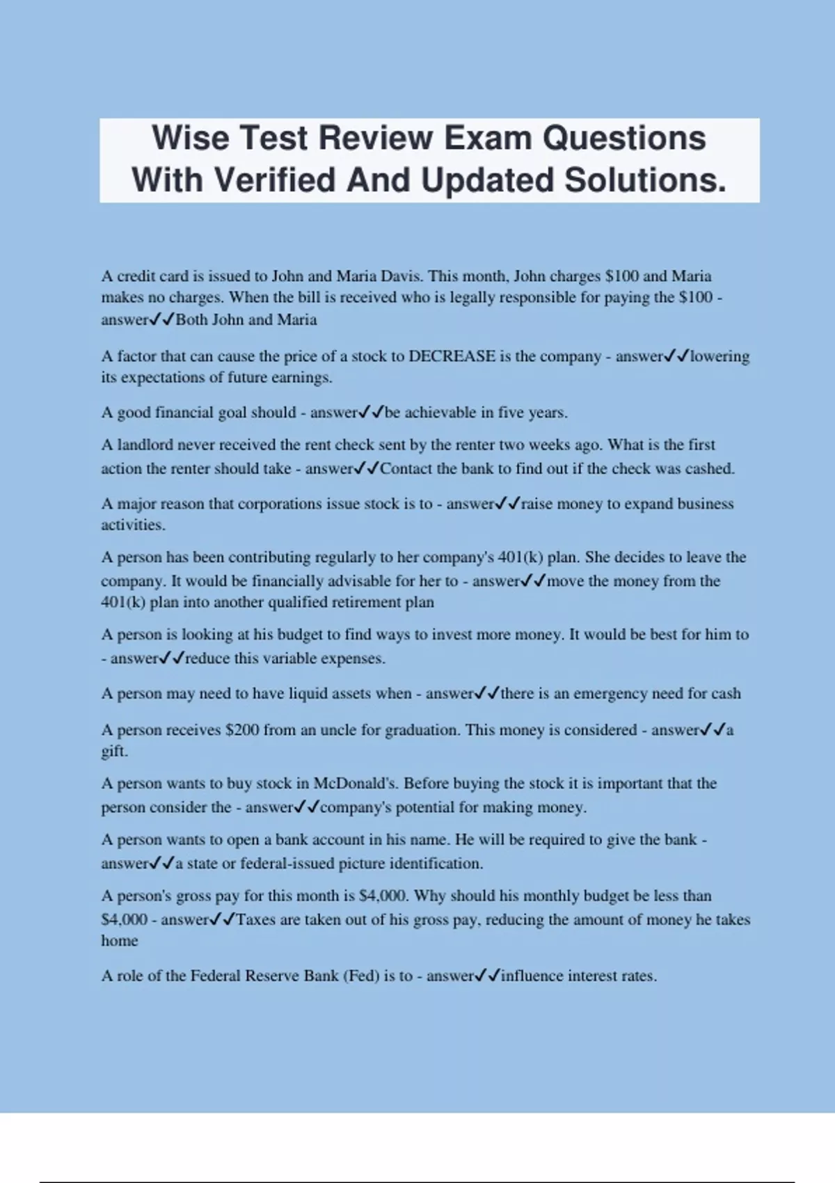 Wise Test Review Exam Questions With Verified And Updated Solutions.