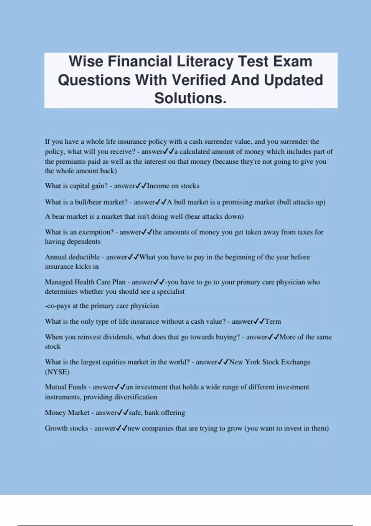 Wise Financial Literacy Test Exam Questions With Verified And Updated Solutions.