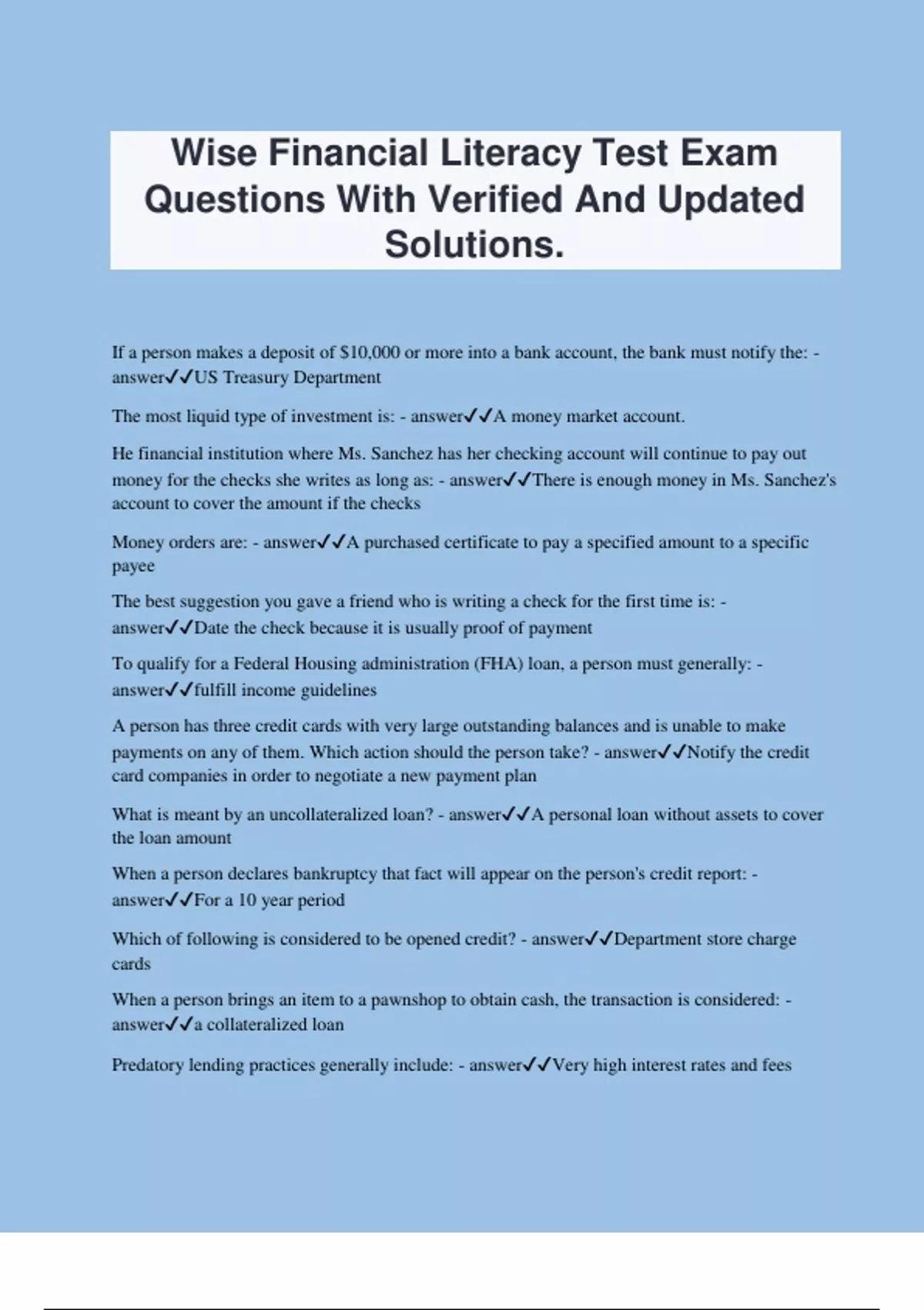 Wise Financial Literacy Test Exam Questions With Verified And Updated Solutions. If a person makes a deposit of $10,000 or more into a bank account, the bank must notify the: - answerUS Treasury Department The most liquid type of investment is: - answerA money market account. He financial institution where Ms. Sanchez has her checking account will continue to pay out money for the checks she writes as long as: - answerThere is enough money in Ms. Sanchez's account to cover the amount if the checks Money orders are: - answerA purchased certificate to pay a specified amount to a specific payee The best suggestion you gave a friend who is writing a check for the first time is: - answerDate the check because it is usually proof of payment To qualify for a Federal Housing administration (FHA) loan, a person must generally: - answerfulfill income guidelines A person has three credit cards with very large outstanding balances and is unable to make payments on any of them. Which action should the person take? - answerNotify the credit card companies in order to negotiate a new payment plan What is meant by an uncollateralized loan? - answerA personal loan without assets to cover the loan amount When a person declares bankruptcy that fact will appear on the person's credit report: - answerFor a 10 year period Which of following is considered to be opened credit? - answerDepartment store charge cards When a person brings an item to a pawnshop to obtain cash, the transaction is considered: - answera collateralized loan Predatory lending practices generally include: - answerVery high interest rates and fees