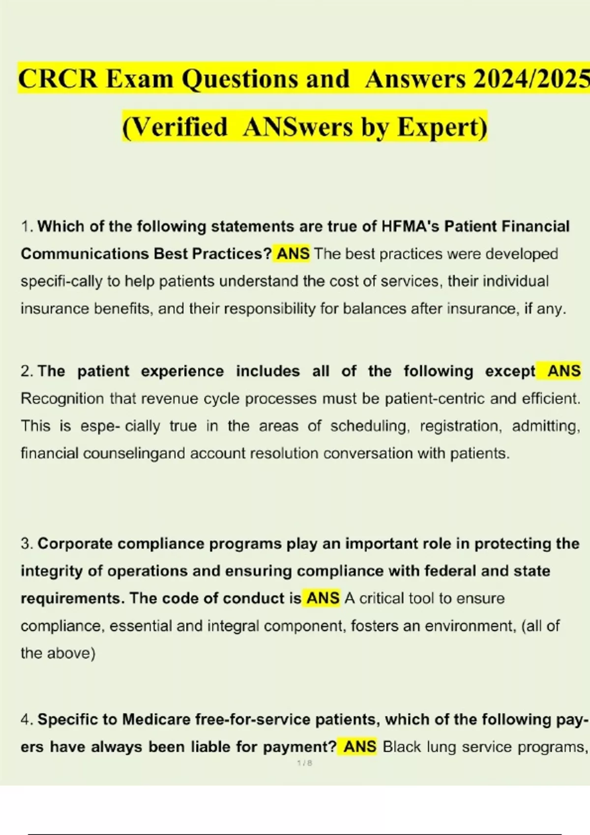 CRCR Exam Questions and Answers 2024/2025 (Verified ANSwers by Expert) 1. Which of the following statements are true of HFMA's Patient Financial Communications Best Practices? ANS The best practices were developed specifi-cally to help patients understand the cost of services, their individual insurance benefits, and their responsibility for balances after insurance, if any. 2. The patient experience includes all of the following except ANS Recognition that revenue cycle processes must be patient-centric and efficient. This is espe- cially true in the areas of scheduling, registration, admitting, financial counselingand account resolution conversation with patients. 3. Corporate compliance programs play an important role in protecting the integrity of operations and ensuring compliance with federal and sta