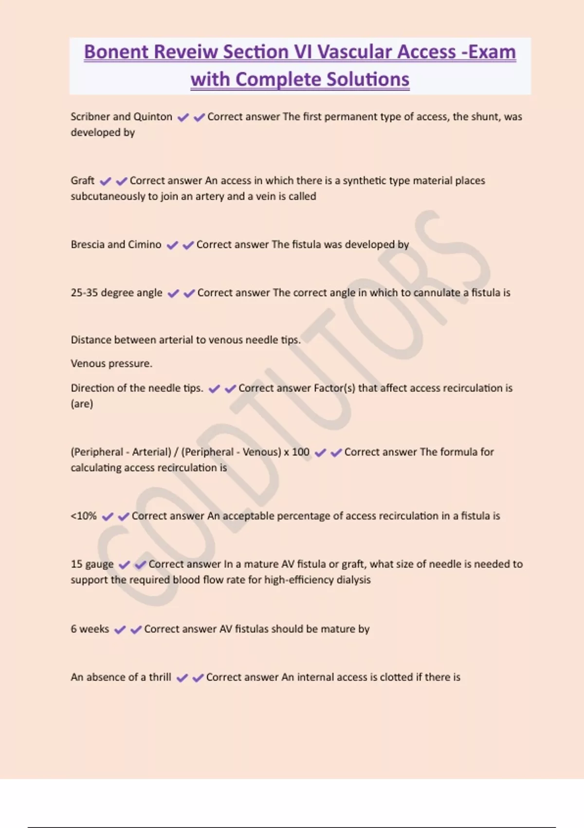 Bonent Reveiw Section VI Vascular Access -Exam with Complete Solutions Scribner and Quinton Correct answer The first permanent type of access, the shunt, was developed by Graft Correct answer An access in which there is a synthetic type material places subcutaneously to join an artery and a vein is called Brescia and Cimino Correct answer The fistula was developed by 25-35 degree angle Correct answer The correct angle in which to cannulate a fistula is Distance between arterial to venous needle tips
