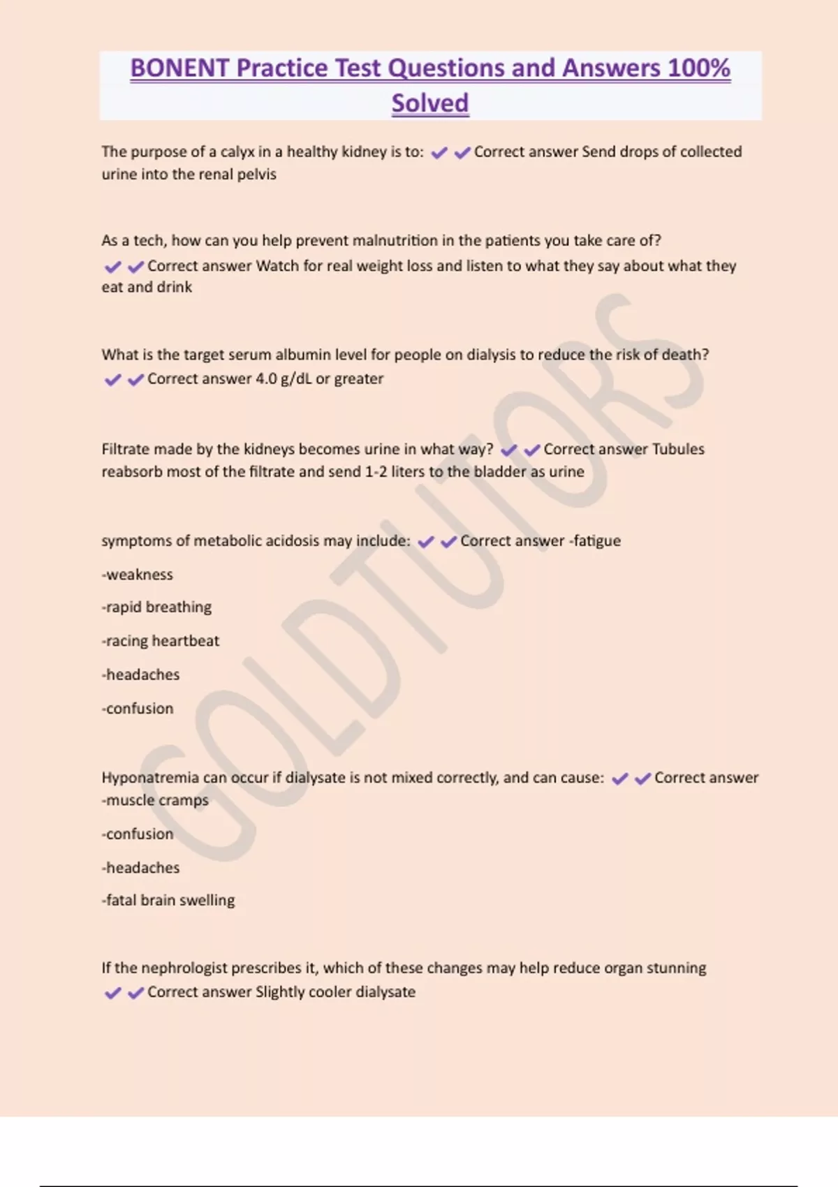 BONENT Practice Test Questions and Answers 100% Solved The purpose of a calyx in a healthy kidney is to: Correct answer Send drops of collected urine into the renal pelvis As a tech, how can you help prevent malnutrition in the patients you take care of? Correct answer Watch for real weight loss and listen to what they say about what they eat and drink What is the target serum albumin level for people on dialysis to reduce the risk of death? Correct answer 4.0 g/dL or greater