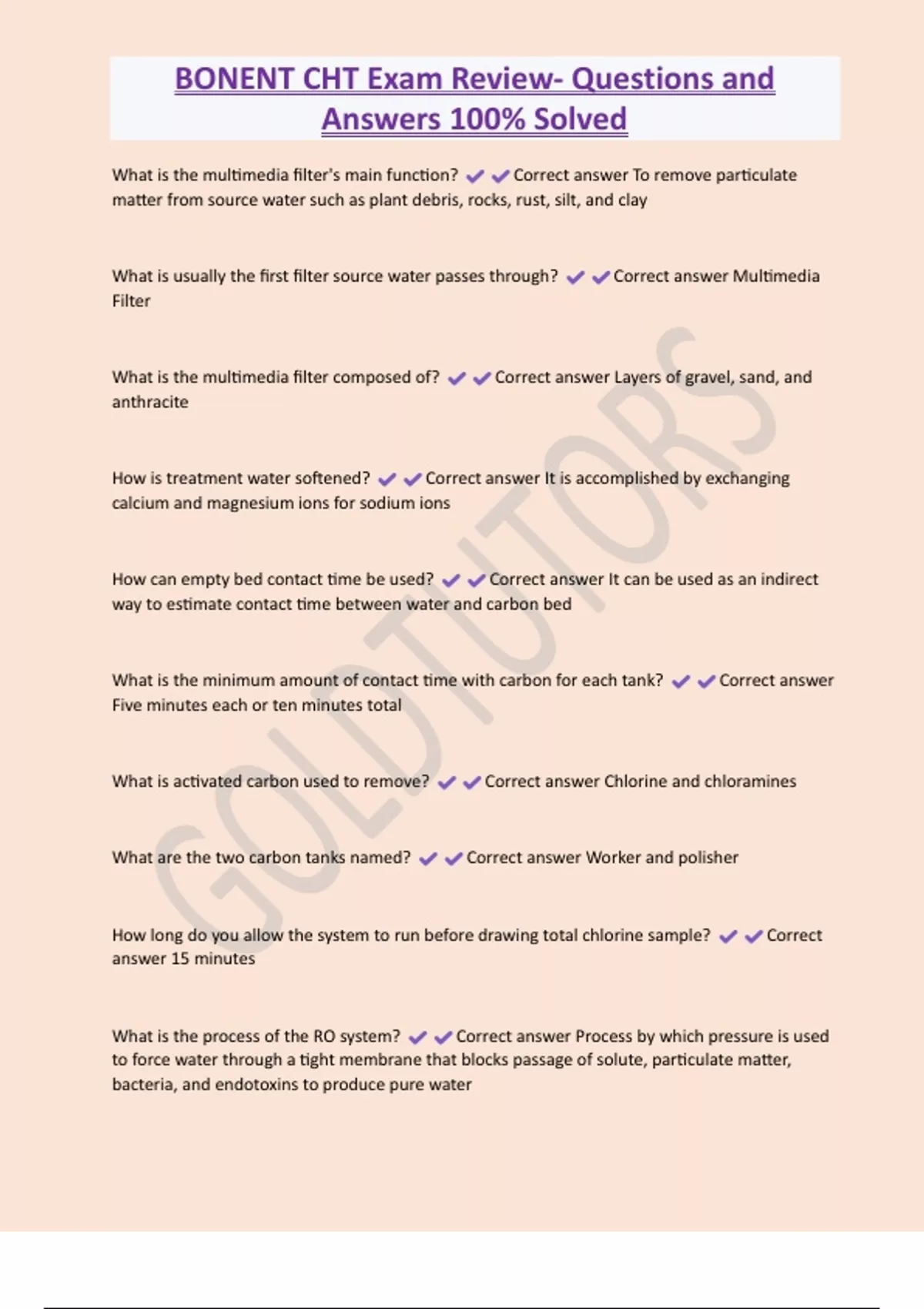 BONENT CHT Exam Review- Questions and Answers 100% Solved What is the multimedia filter's main function? Correct answer To remove particulate matter from source water such as plant debris, rocks, rust, silt, and clay What is usually the first filter source water passes through? Correct answer Multimedia Filter What is the multimedia filter composed of? Correct answer Layers of gravel, sand, and anthracite How is treatment water softened? Correct answer It is accomplished by exchanging calcium and magnesium ions for sodium ions