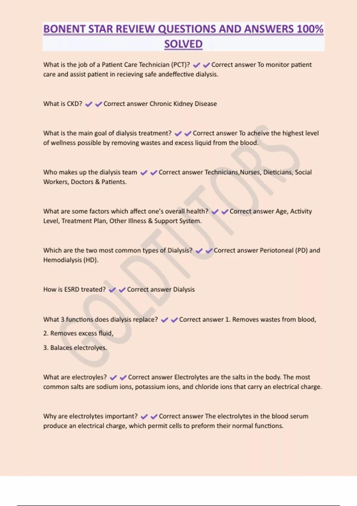 BONENT STAR REVIEW QUESTIONS AND ANSWERS 100% SOLVED What is the job of a Patient Care Technician (PCT)? Correct answer To monitor patient care and assist patient in recieving safe andeffective dialysis. What is CKD? Correct answer Chronic Kidney Disease What is the main goal of dialysis treatment? Correct answer To acheive the highest level of wellness possible by removing wastes and excess liquid from the blood. Who makes up the dialysis team Correct answer Technicians,Nurses, Dieticians, Social Workers, Doctors & Patients. What are some factors which affect one's overall health? Correct answer Age, Activity Level, Treatment Plan, Other Illness & Support System