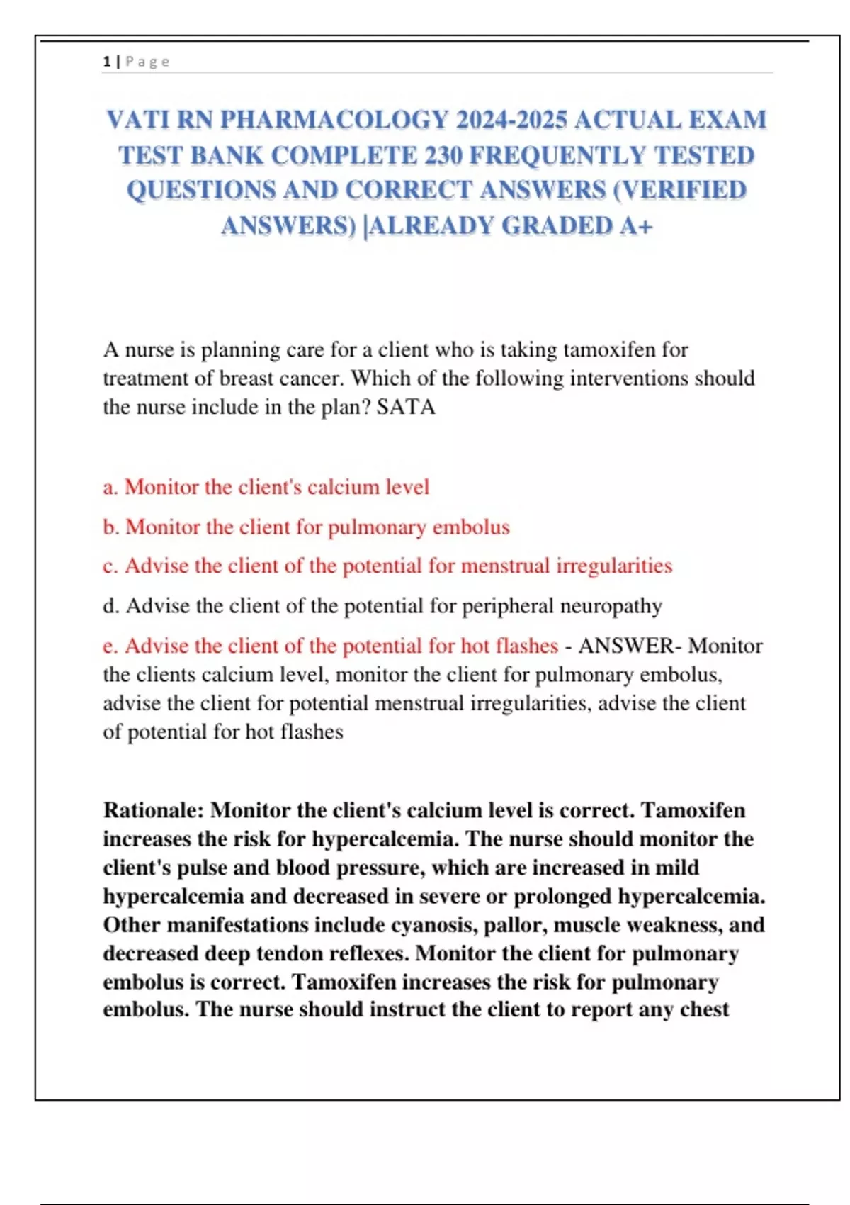 VATI RN PHARMACOLOGY ACTUAL EXAM TEST BANK COMPLETE 230 FREQUENTLY TESTED QUESTIONS AND CORRECT ANSWERS (VERIFIED ANSWERS) |ALREADY GRADED A+