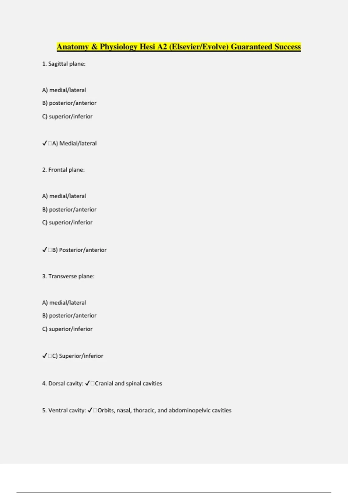 Anatomy & Physiology Hesi A2 (Elsevier/Evolve) Guaranteed Success 1. Sagittal plane: A) medial/lateral B) posterior/anterior C) superior/inferior ️A) Medial/lateral 2. Frontal plane: A) medial/lateral B) posterior/anterior C) superior/inferior ️B) Posterior/anterior 3. Transverse plane: A) medial/lateral B) posterior/anterior C) superior/inferior ️C) Superior/inferior 4. Dorsal cavity: ️Cranial and spinal cavities 5. Ventral cavity: ️Orbits, nasal, thoracic, and abdominopelvic cavities 6. Histology: ️The study of tissues 7. Epithelial cells: A) neurons and connective tissue cells B) framework of the body, providing support and structure for the organs C) cover, line, and protect the body and internal organs D) can contract or shorten ️C) Cover, line, and protect the body and internal organs Connective tissue A) neurons and connective tissue cells B) framework of body, providing support and structure for the organs C) cover, line, and protect the body and internal organs