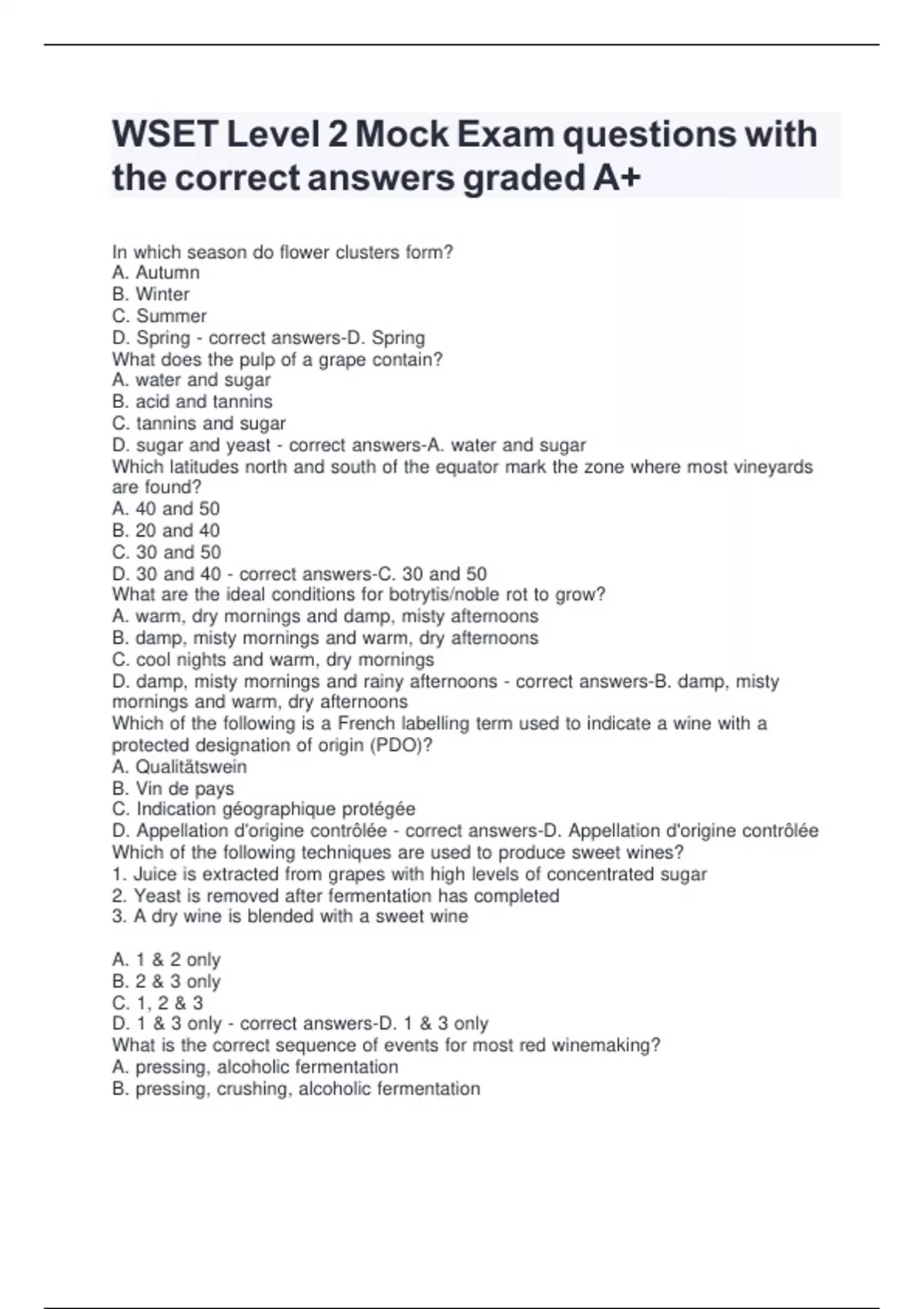 WSET Level 2 Mock Exam questions with the correct answers graded A+