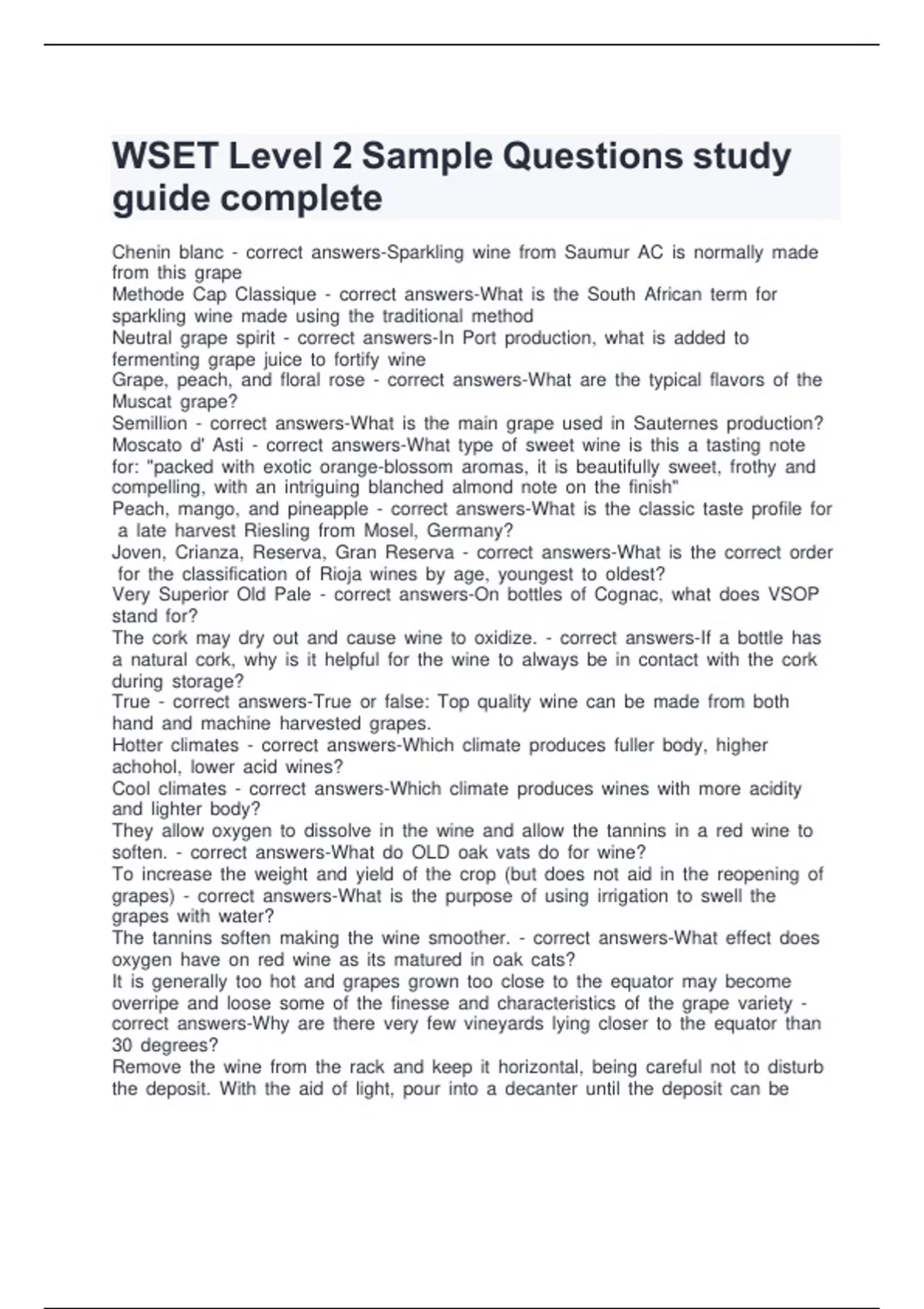 WSET Level 2 Sample Questions study guide completeWSET k Level k 2 k Sample k Questions k study k guide k complete Chenin k blanc k - k correct k answers-Sparkling k wine k from k Saumur k AC k is k normally k made k from k this k grape Methode k Cap k Classique k - k correct k answers-What k is k the k South k African k term k for k sparkling k wine k made k using k the k traditional k method Neutral k grape k spirit k - k correct k answers-In k Port k production, k what k is k added k to k fermenting k grape k juice k to k fortify k wine Grape, k peach, k and k floral k rose k - k correct k answers-What k are k the k typical k flavors k of k the k Muscat k grape? Semillion k - k correct k answers-What k is k the k main k grape k used k in k Sauternes k production? Moscato k d' k Asti k - k correct k answers-What k type k of k sweet k wine k is k this k a k tasting k note k for: k "packed k with k exotic k orange-blossom k aromas, k it k is k beautifully k sweet, k frothy k and k compelling, k with k an k intriguing k blanched k almond k note k on k the k finish" Peach, k mango, k and k pineapple k - k correct k answers-What k is k the k classic k taste k profile k for k a k late k harvest k Riesling k from k Mosel, k Germany? Joven, k Crianza, k Reserva, k Gran k Reserva k - k correct k answers-What k is k the k correct k order k for k the k classification k of k Rioja k wines k by k age, k youngest k to k oldest? Very k Superior k Old k Pale k - k correct k answers-On k bottles k of k Cognac, k what k does k VSOP k stand k for? The k cork k may k dry k out k and k cause k wine k to k oxidize. k - k correct k answers-If k a k bottle k has k a k natural k cork, k why k is k it k helpful k for k the k wine k to k always k be k in k contact k with k the k cork k during k storage? True k - k correct k answers-True k or k false: k Top k quality k wine k can k be k made k from k both k hand k and k machine k harvested k grapes. Hotter k climates k - k correct k answers-Which k climate k produces k fuller k body, k higher k achohol, k lower k acid k wines? Cool k climates k - k correct k answers-Which k climate k produces k wines k with k more k acidity k and k lighter k body? They k allow k oxygen k to k dissolve k in k the k wine k and k allow k the k tannins k in k a k red k wine k to k soften. k - k correct k answers-What k do k OLD k oak k vats k do k for k wine? To k increase k the k weight k and k yield k of k the k crop k (but k does k not k aid k in k the k reopening k of k grapes) k - k correct k answers-What k is k the k purpose k of k using k irrigation k to k swell k the k grapes k with k water? The k tannins k soften k making k the k wine k smoother. k - k correct k answers-What k effect k does k oxygen k have k on k red k wine k as k its k matured k in k oak k cats? It k is k generally k too k hot k and k grapes k grown k too k close k to k the k equator k may k become k overripe k and k loose k some k of k the k finesse k and k characteristics k of k the k grape k variety k - k correct k answers-Why k are k there k very k few k vineyards k lying k closer k to k the k equator k than k 30 k degrees? Remove k the k wine k from k the k rack k and k keep k it k horizontal, k being k careful k not k to k disturb k the k deposit. k With k the k aid k of k light, k pour k into