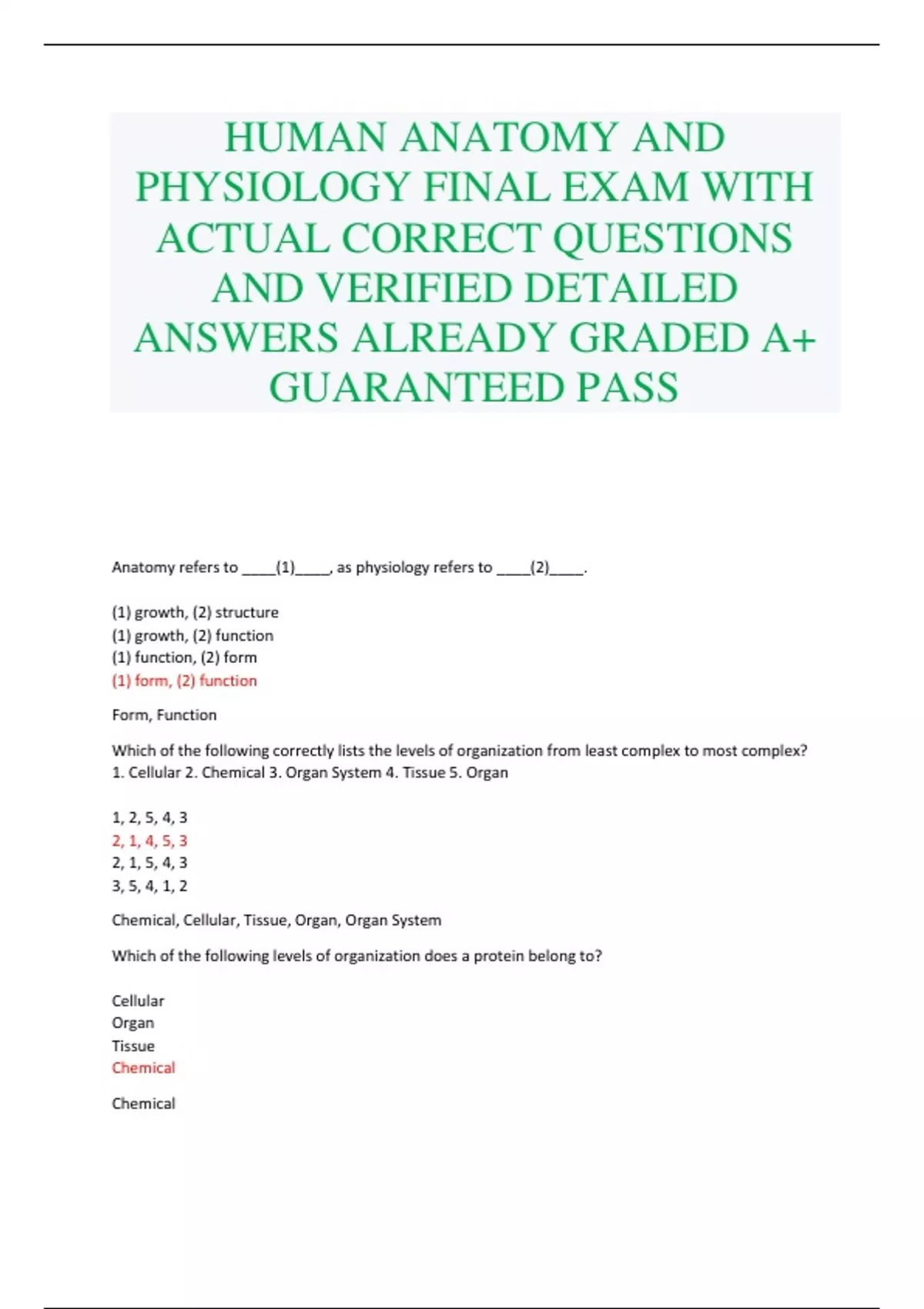HUMAN ANATOMY AND PHYSIOLOGY FINAL EXAM WITH ACTUAL CORRECT QUESTIONS AND VERIFIED DETAILED ANSWERS ALREADY GRADED A+ GUARANTEED PASS