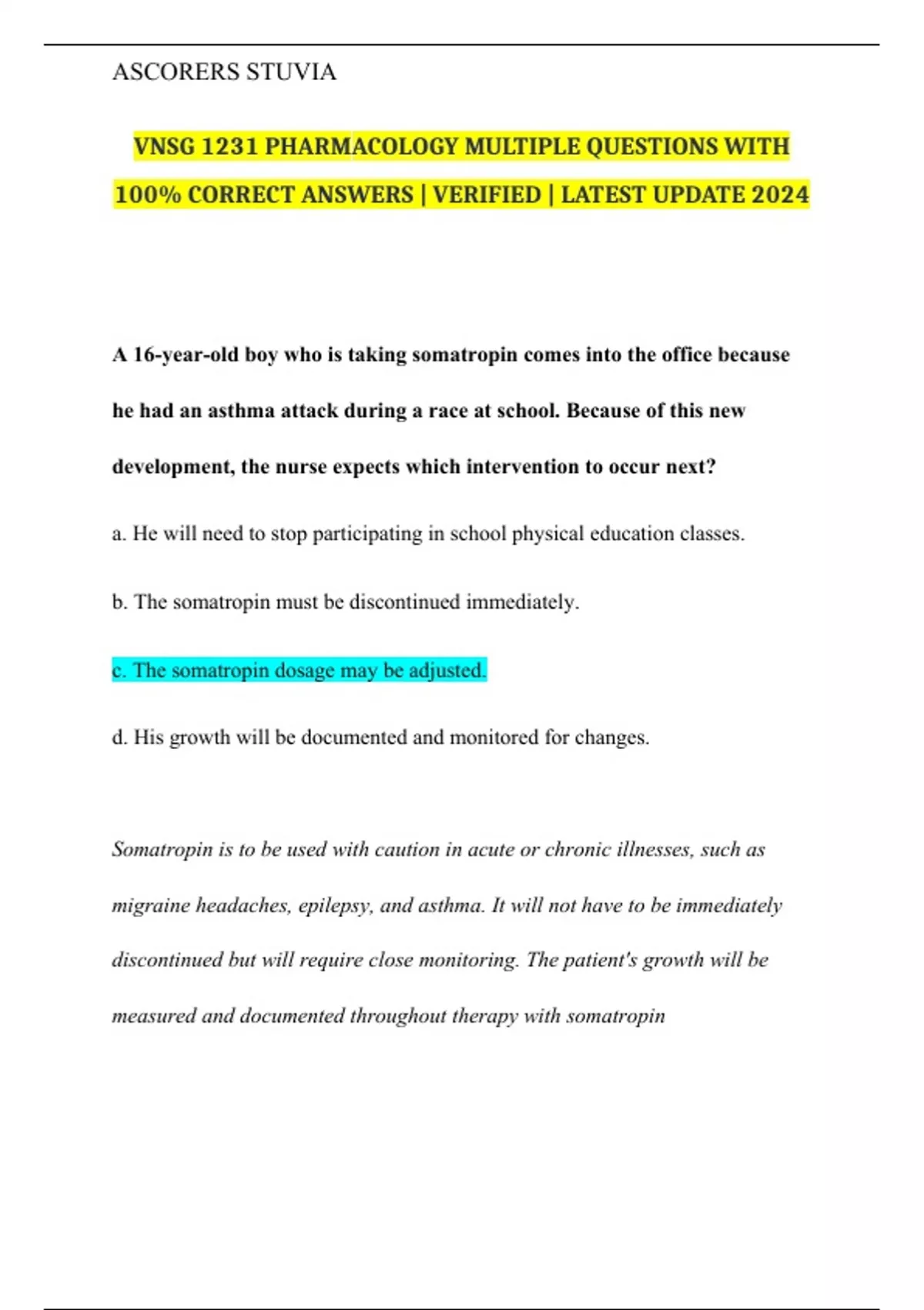 VNSG 1231 PHARMACOLOGY MULTIPLE QUESTIONS WITH 100% CORRECT ANSWERS | VERIFIED | LATEST UPDATE 2024