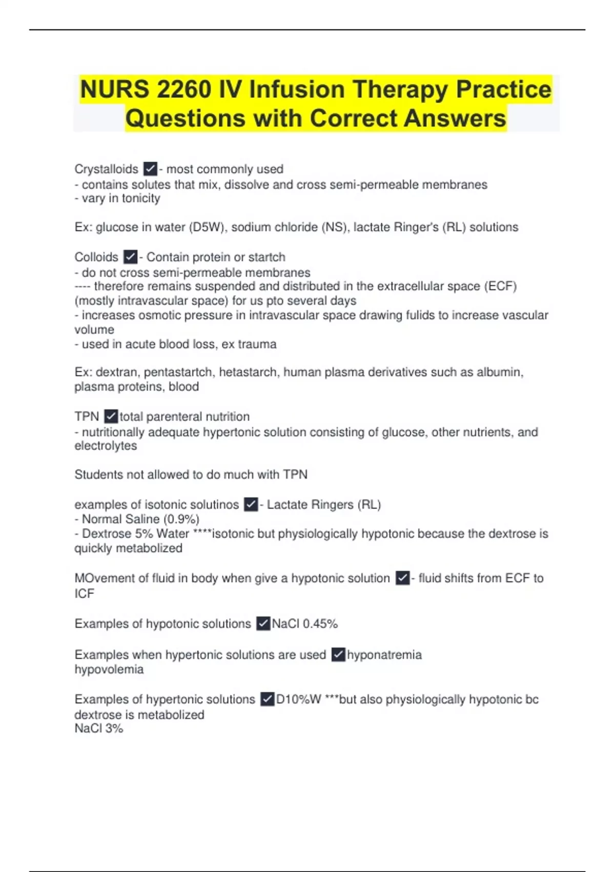 NURS 2260 IV Infusion Therapy Practice Questions with Correct Answers