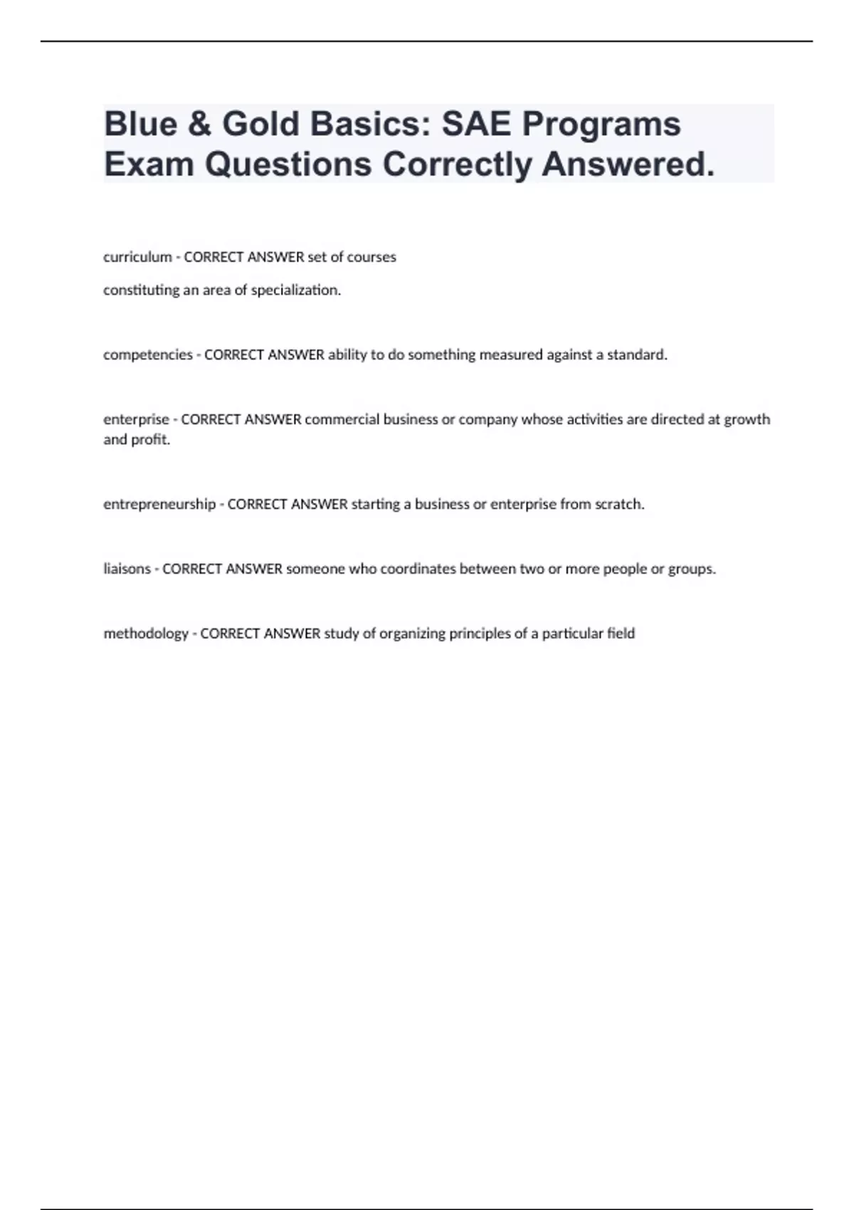 Blue & Gold Basics: SAE Programs Exam Questions Correctly Answered. curriculum - CORRECT ANSWER set of courses constituting an area of specialization.