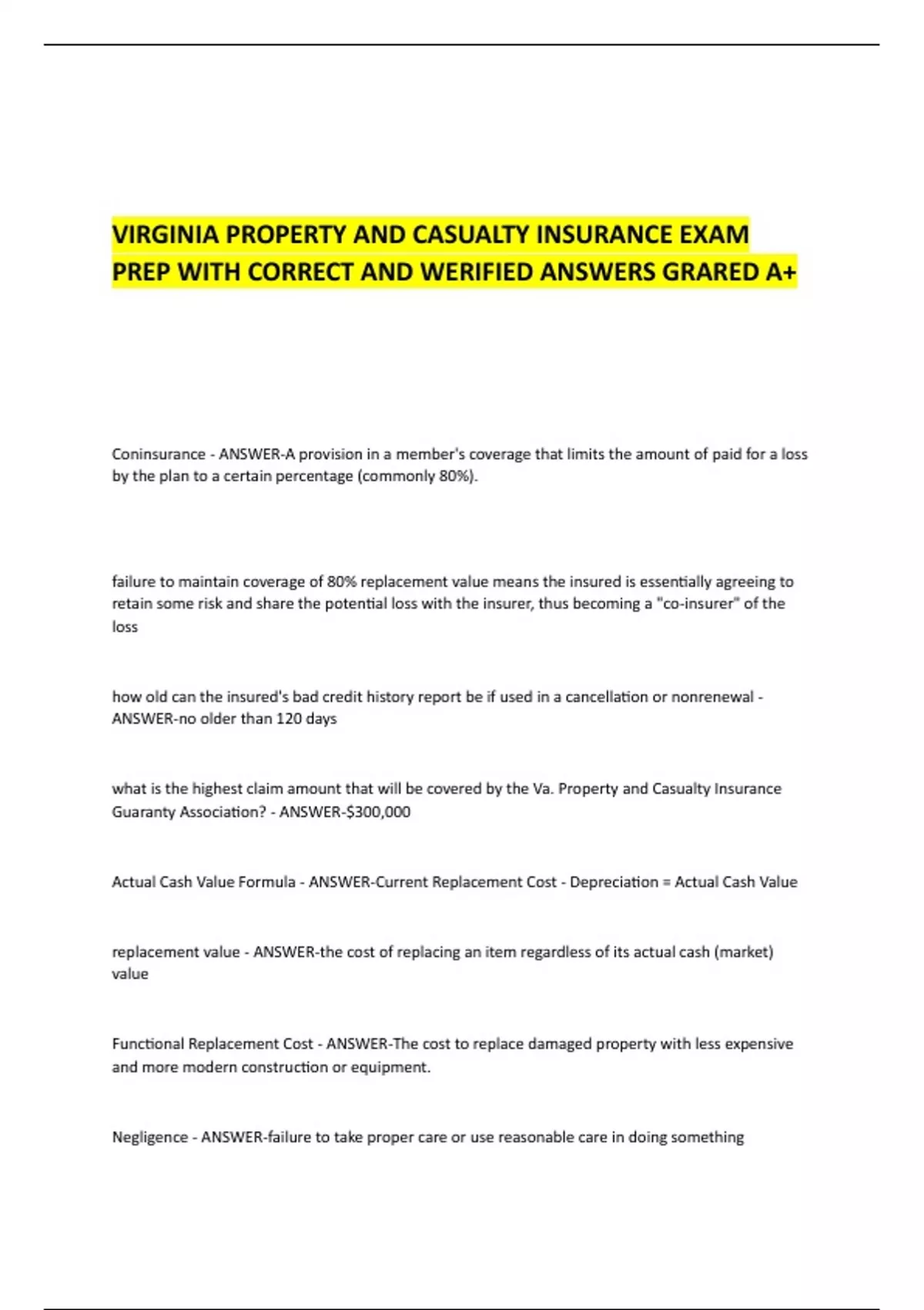 VIRGINIA PROPERTY AND CASUALTY INSURANCE EXAM PREP WITH CORRECT AND WERIFIED ANSWERS GRARED A+