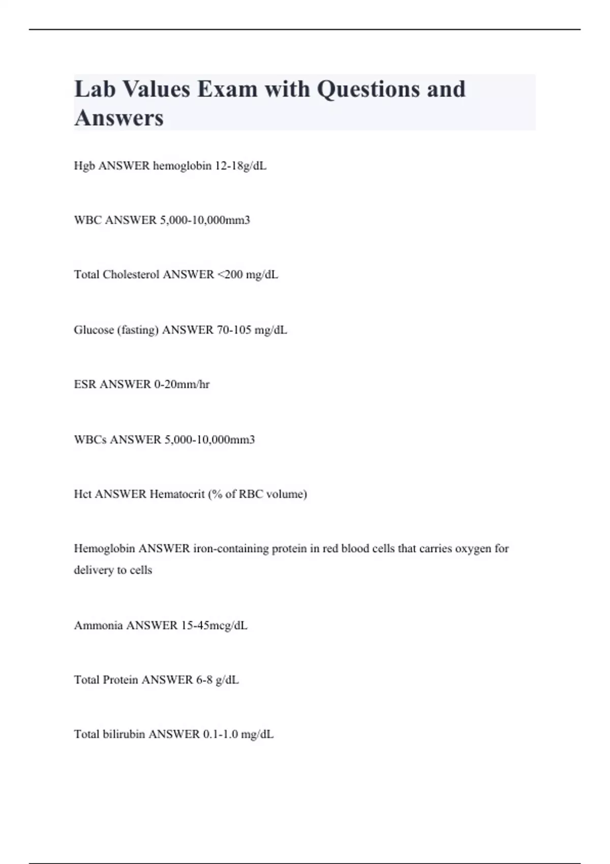 Lab Values Exam with Questions and Answers Hgb ANSWER hemoglobin 12-18g/dL WBC ANSWER 5,000-10,000mm3 Total Cholesterol ANSWER <200 mg/dL Glucose (fasting) ANSWER 70-105 mg/dL ESR ANSWER 0-20mm/hr WBCs ANSWER 5,000-10,000mm3 Hct ANSWER Hematocrit (% of RBC volume) Hemoglobin ANSWER iron-containing protein in red blood cells that carries oxygen for delivery to cells Ammonia ANSWER 15-45mcg/dL Total Protein ANSWER 6-8 g/dL Total bilirubin ANSWER 0.1-1.0 mg/dL