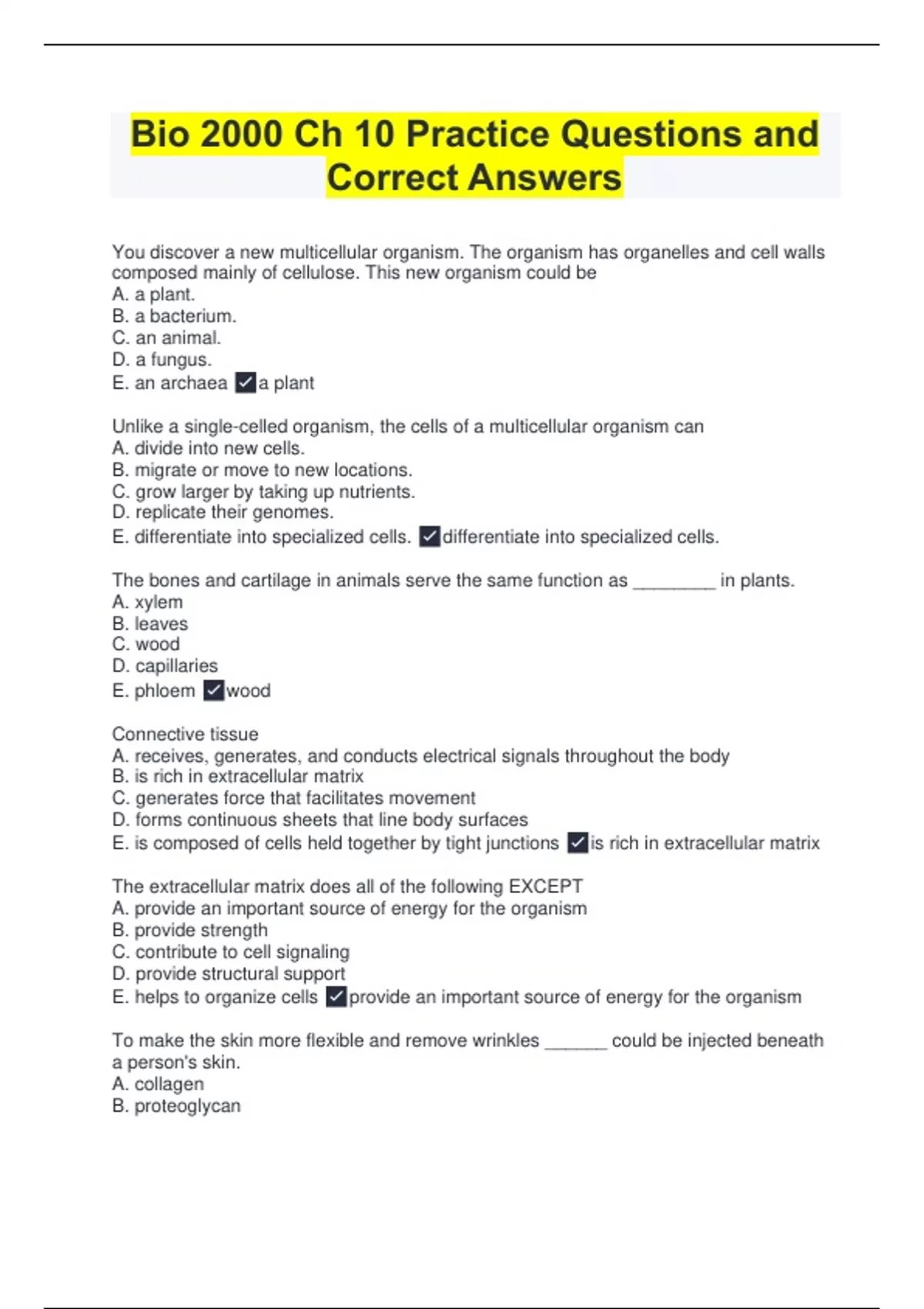 You discover a new multicellular organism. The organism has organelles and cell walls composed mainly of cellulose. This new organism could be A. a plant. B. a bacterium. C. an animal. D. a fungus. E. an archaea a plant Unlike a single-celled organism, the cells of a multicellular organism can A. divide into new cells. B. migrate or move to new locations. C. grow larger by taking up nutrients. D. replicate their genomes. E. differentiate into specialized cells. differentiate into specialized cells. The bones and cartilage in animals serve the same function as ________ in plants. A. xylem B. leaves C. wood D. capillaries E. phloem wood Connective tissue A. receives, generates, and conducts electrical signals throughout the body B. is rich in extracellular matrix C. generates force that facilitates movement D. forms continuous sheets that line body surfaces E. is composed of cells held together by tight junctions is rich in extracellular matrix The extracellular matrix does all of the following EXCEPT A. provide an important source of energy for the organism B. provide strength C. contribute to cell signaling D. provide structural support E. helps to organize cells provide an important source of energy for the organism