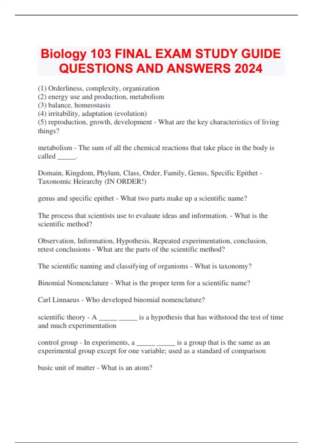 Biology 103 FINAL EXAM STUDY GUIDE QUESTIONS AND ANSWERS 2024