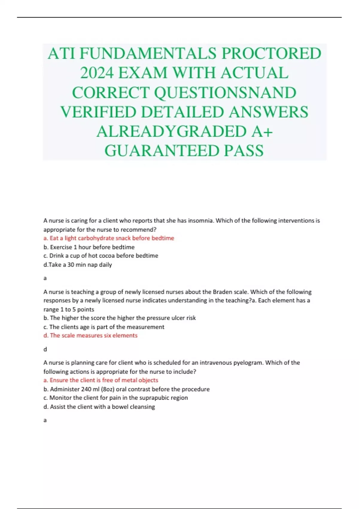 ATI FUNDAMENTALS PROCTORED 2024 EXAM WITH ACTUAL CORRECT QUESTIONSNAND VERIFIED DETAILED ANSWERS ALREADYGRADED A+ GUARANTEED PASS
