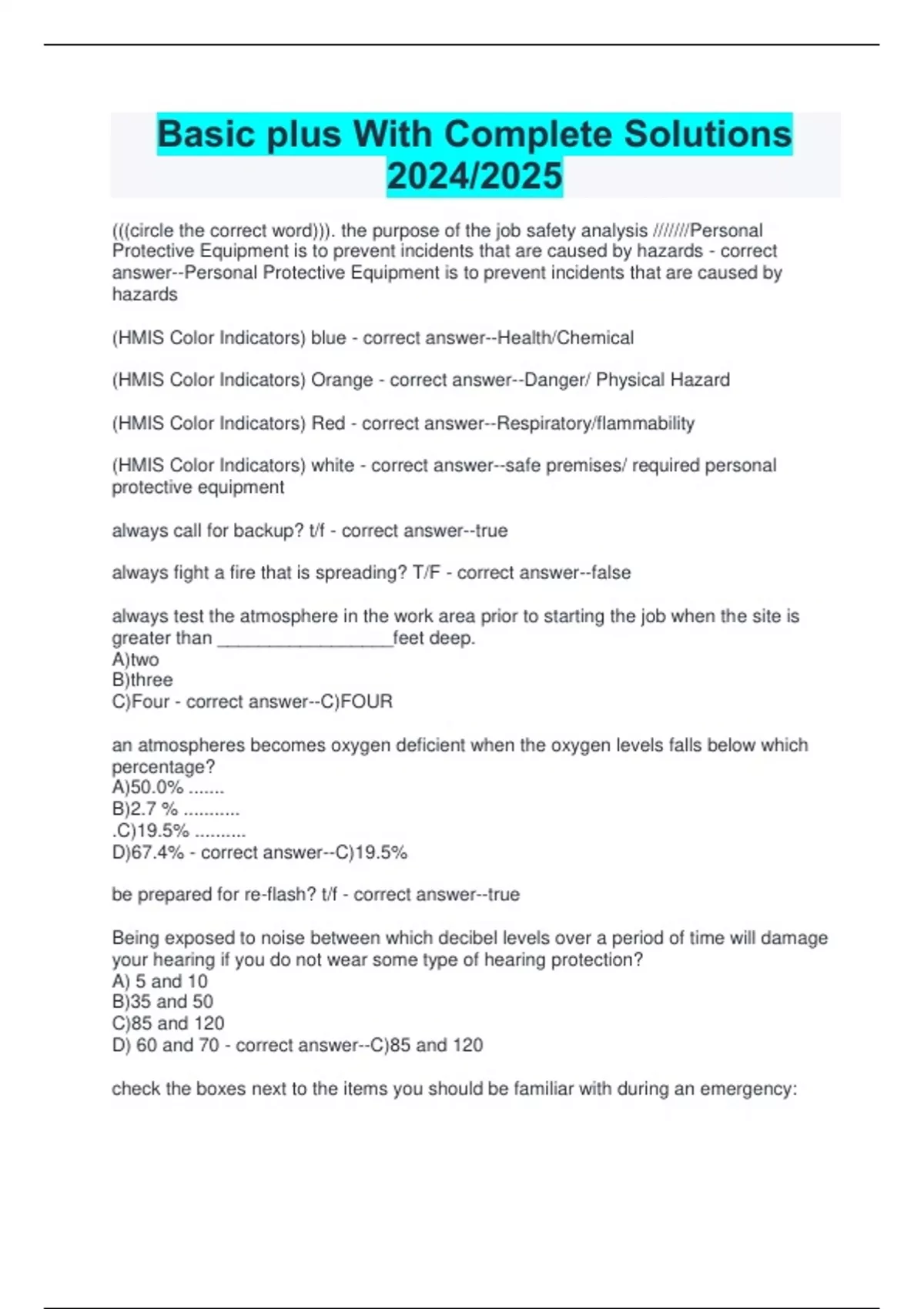 (((circle the correct word))). the purpose of the job safety analysis ///////Personal Protective Equipment is to prevent incidents that are caused by hazards - correct answer--Personal Protective Equipment is to prevent incidents that are caused by hazards (HMIS Color Indicators) blue - correct answer--Health/Chemical (HMIS Color Indicators) Orange - correct answer--Danger/ Physical Hazard (HMIS Color Indicators) Red - correct answer--Respiratory/flammability (HMIS Color Indicators) white - correct answer--safe premises/ required personal protective equipment always call for backup? t/f - correct answer--true always fight a fire that is spreading? T/F - correct answer--false always test the atmosphere in the work area prior to starting the job when the site is greater than _________________feet deep. A)two B)three C)Four - correct answer--C)FOUR an atmospheres becomes oxygen deficient when the oxygen levels falls below which percentage? A)50.0% ....... B)2.7 % ........... .C)19.5% .......... D)67.4% - correct answer--C)19.5% be prepared for re-flash? t/f - correct answer--true Being exposed to noise between which decibel levels over a period of time will damage your hearing if you do not wear some type of hearing protection? A) 5 and 10 B)35 and 50 C)85 and 120 D) 60 and 70 - correct answer--C)85 and 120 check the boxes next to the items you should be familiar with during an emergency: