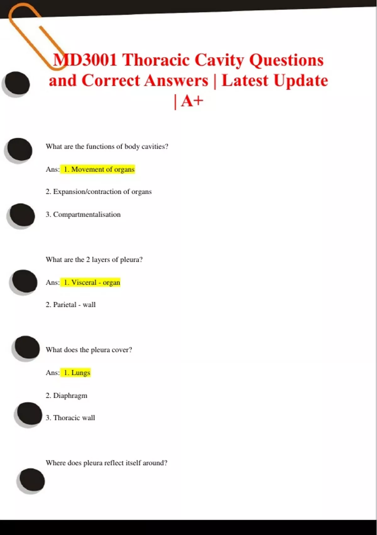 MD3001 Thoracic Cavity Questions and Correct Answers | Latest Update | A+