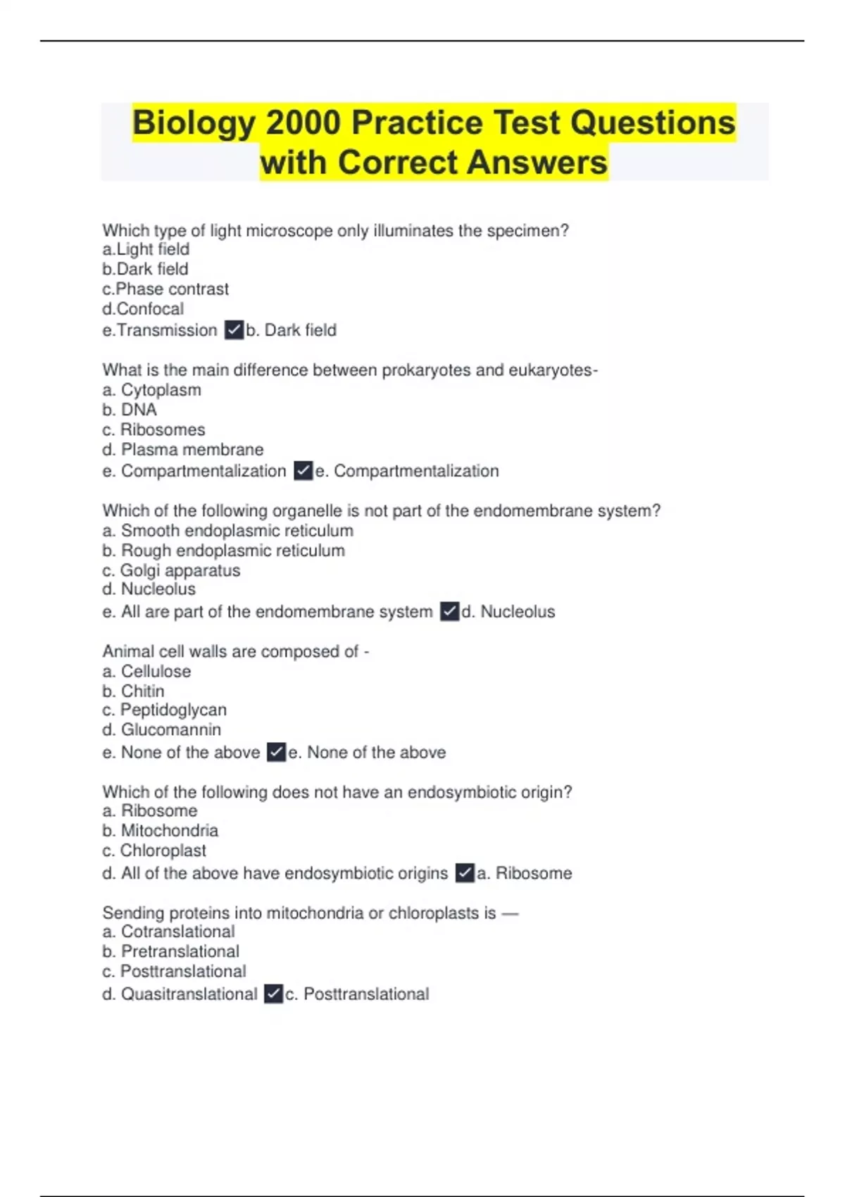 Which type of light microscope only illuminates the specimen? a.Light field b.Dark field c.Phase contrast d.Confocal e.Transmission b. Dark field What is the main difference between prokaryotes and eukaryotes- a. Cytoplasm b. DNA c. Ribosomes d. Plasma membrane e. Compartmentalization e. Compartmentalization Which of the following organelle is not part of the endomembrane system? a. Smooth endoplasmic reticulum b. Rough endoplasmic reticulum c. Golgi apparatus d. Nucleolus e. All are part of the endomembrane system d. Nucleolus Animal cell walls are composed of - a. Cellulose b. Chitin c. Peptidoglycan d. Glucomannin e. None of the above e. None of the above Which of the following does not have an endosymbiotic origin? a. Ribosome b. Mitochondria c. Chloroplast d. All of the above have endosymbiotic origins a. Ribosome Sending proteins into mitochondria or chloroplasts is — a. Cotranslational b. Pretranslational c. Posttranslational d. Quasitranslational c. Posttranslational