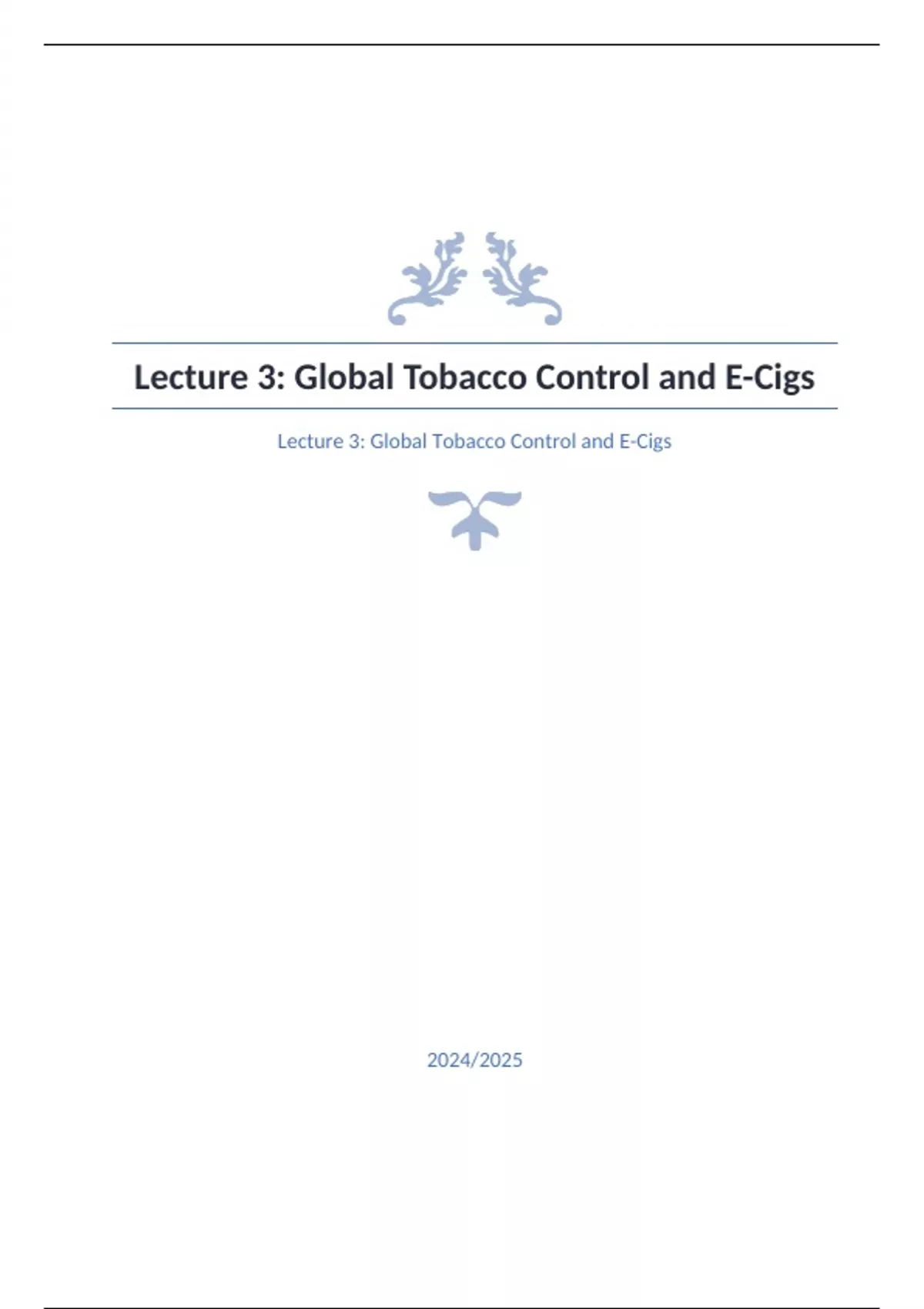 Lecture 3 Question and answers verified to pass Green Tobacco Sickness - correct answer A type of nicotine poisoning caused by the dermal absorption of nicotine from the surface of wet tobacco plants.[1] Tobacco harvesters, whose clothing becomes saturated from tobacco wet with rain or morning dew, are at high risk of developing GTS. Negative environmental health effects of tobacco production - correct answer -Deforestation -Use of pesticides/fertilizers -Tobacco depletes nutrients from soil -Green tobacco sickness in farmers -Filters of cigarettes are not biodegradable